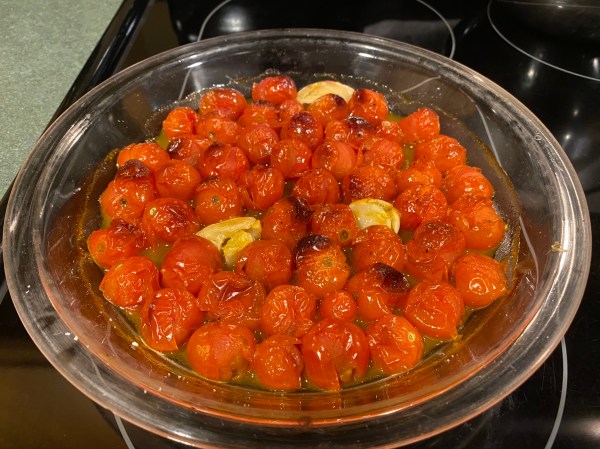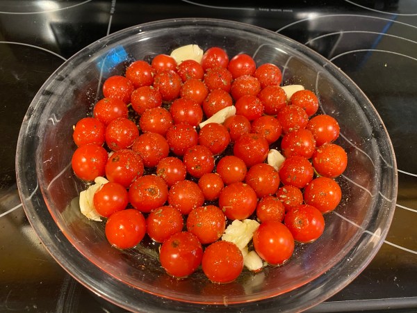 in a glass pie plate, fill the pie plate with small cherry tomatoes, stems removed (if they are really large, cut in half)