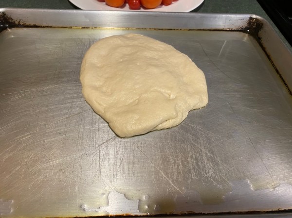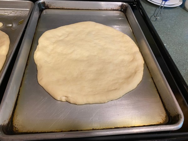 Shape each into a flattened disk and place on an oiled rimmed cookie sheet. I pour some oil on the cookie sheet and spread with a brush. Gently press the dough into a 12 inch circle, letting it rest for about 15 minutes if it starts to shrink back. Repeating this until you get the size. I give myself about 45 minutes to an hour to make this happen.