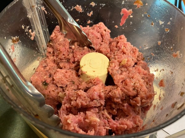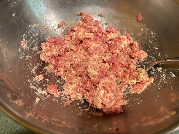 Heat oven to 425 degrees. In a large bowl combine all the ingredients EXCEPT the pork. Stir together thoroughly. Add the pork and stir with a large fork, not your hands, until ingredients are distributed evenly.