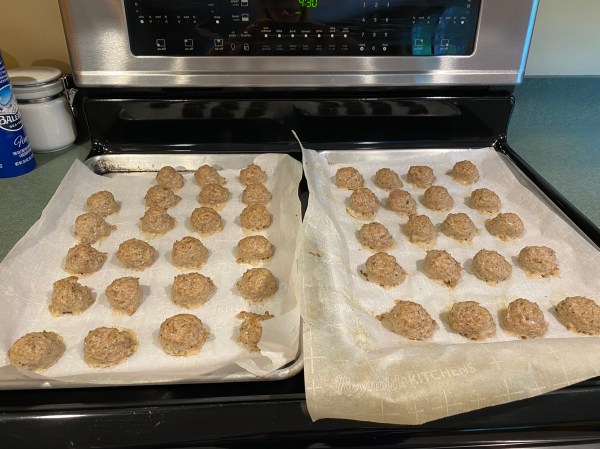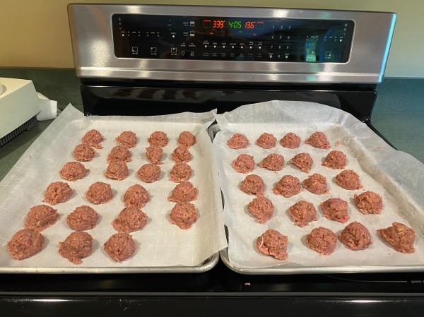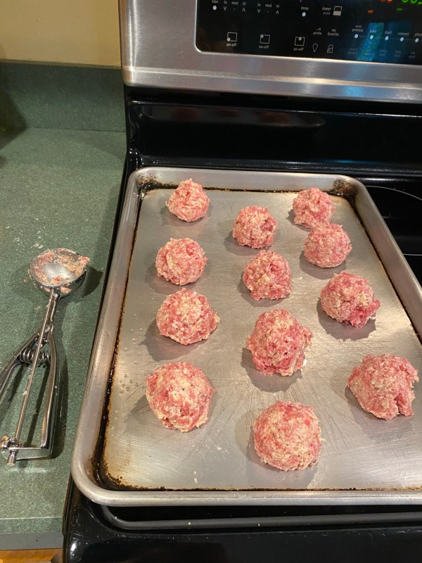 Shape the meatballs into 12 equally sized balls. I used an ice cream scoop and it worked out very well. Arrange on a greased rimmed baking sheet.