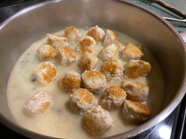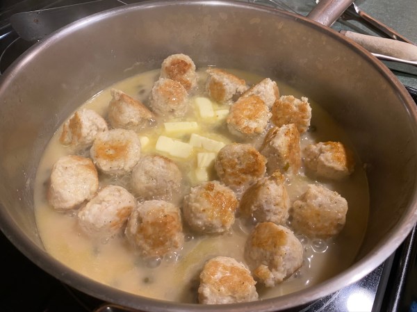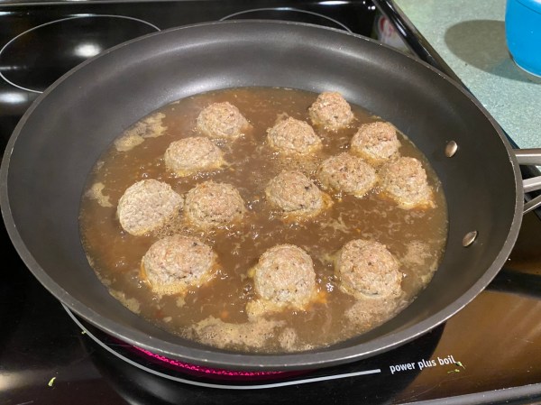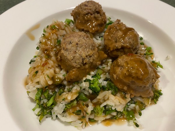 This is a pretty simple but delicious recipe from Cooking Light. I do recommend doubling up on the meatballs. If you are making once the recipe, the sauce needs to double as well. Well that’s what we like, it’s up to you. Usually pork tenderloins come in a pound or so package and 20 ounces is 1 lb. 4 oz. so if you double the meatballs you could use all the pork tenderloin. Otherwise you will be left with 1/2 a pork tenderloin. And the meatballs freeze well, another good reason to double up.