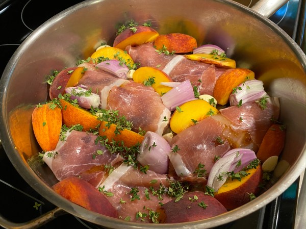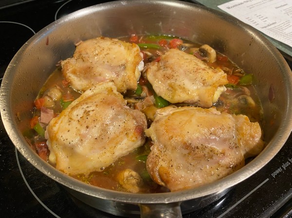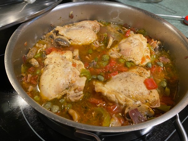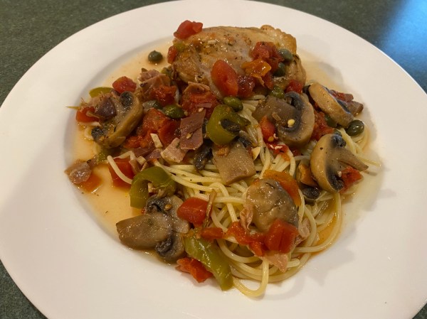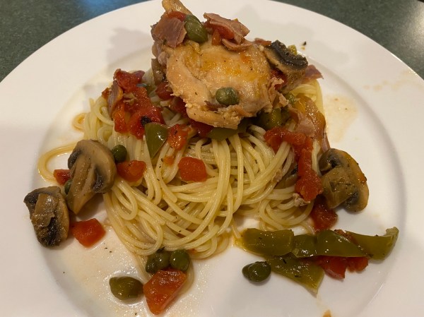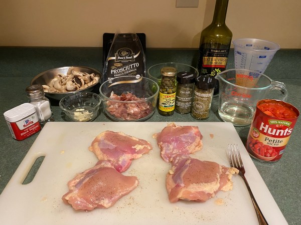 I have reduced the amount of chicken used but have kept the amount of sauce made. I also substituted dried herbs for fresh herbs because upon making this recipe again, fresh was not possible. I also eliminated the parsley because of the same issue. I also am not a big fan of peppers so I substituted 1/2 pepper (my husband enjoys them) and 1/2 mushroom. I have never seen chicken pieces with just the bones and no skin. So this is not something that is difficult to achieve on chicken breast and chicken thighs. Just get regular bone in pieces and peel the skin off. I used Boars Head packaged proscuitto because it comes in a 3 ounce portion. I also use Hunt’s variety of diced tomatoes. If capers is not your thing, just try it once. They really are delicious. Also, all the changes that I made can be eliminated and you can follow the original recipe, it’s entirely up to you. But give it a try. It is also great the next day. Just simmer it gently until warmed through.