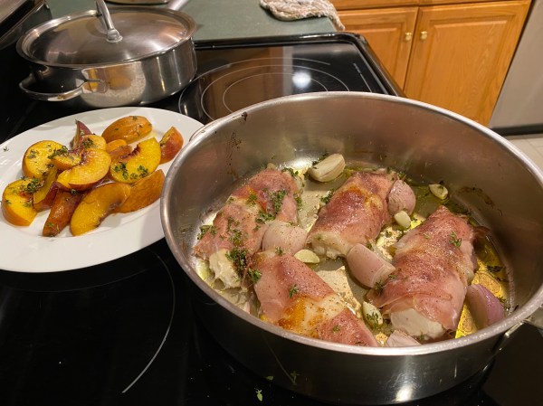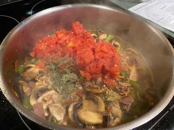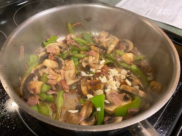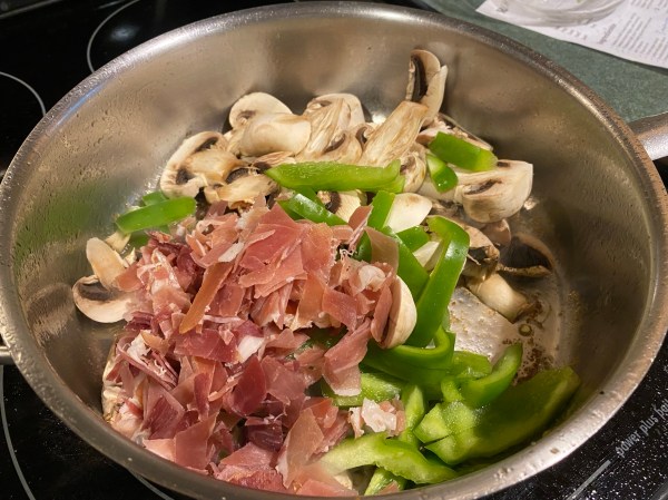 after setting the chicken aside, add mushrooms, peppers, prosciutto and cook: