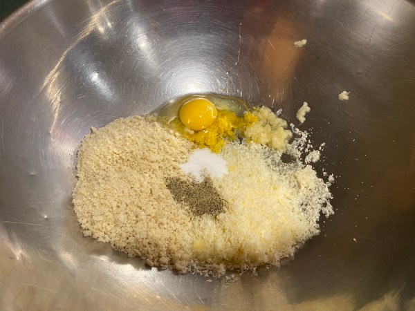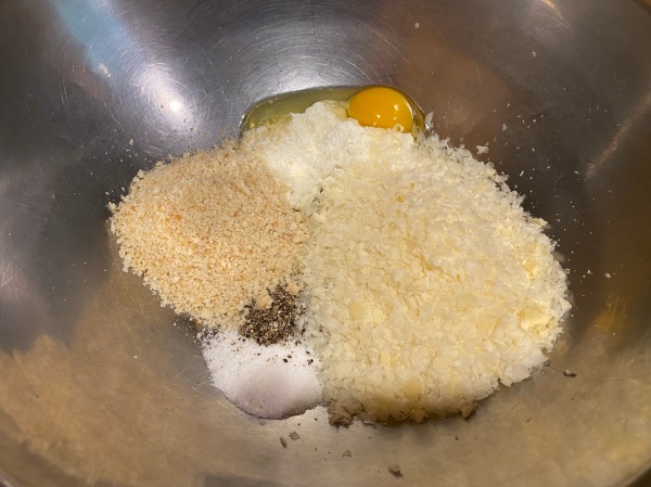 ricotta, Parmesan, salt, pepper, egg, breadcrumbs, mix together: