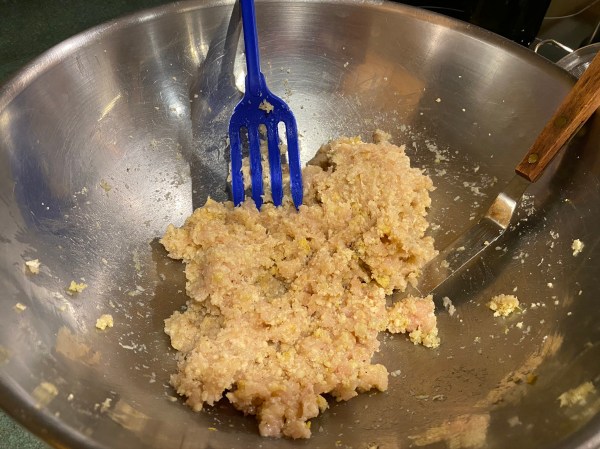 In a very large bowl, combine parmesan cheese through pepper. Stir until very well combined. Then add chicken and stir until just combined. I use a large fork for this. I do not use my hands. Lightly combine the chicken with the other ingredients. If mixed too much, the meatballs will become compressed and hard. Not preferable. Using a purple cookie scoop, make 21 meatballs, about 1-1/2 to 1-3/4 tablespoons each.