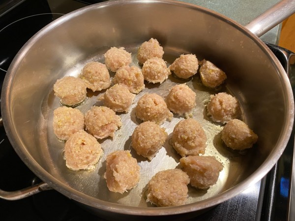 Heat a large skillet (not non stick) over medium heat. Drizzle with about 1 tablespoon of olive oil. Add meatballs. Pick a big enough pan so the meatballs are not crowded into the pan. Cook for about 4-5 minutes until meatballs are nicely browned all over. Remove meatballs to a plate.