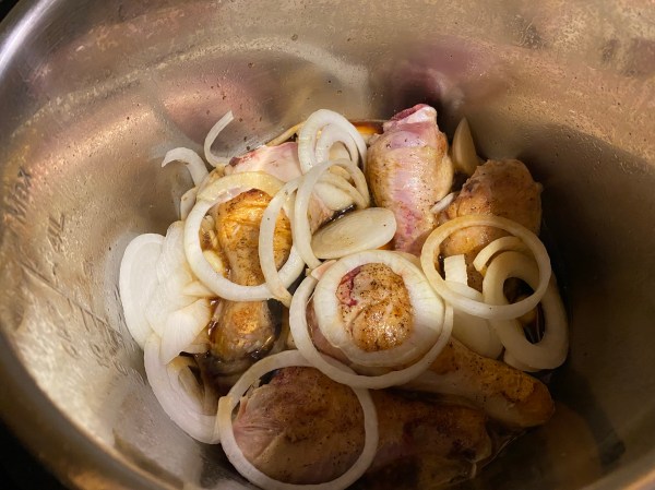 Season the chicken with salt and pepper. Turn the Instant Pot to the high sauté setting. Add the oil and once it is hot, add the chicken in batches (I browned 3 drumsticks, then 2. With the thighs, I browned 2 thighs and then the other 2) and brown on both sides, about 7-10 minutes total. Set chicken aside on a plate and discard the oil that’s in the Instant Pot. Return the chicken to the pot.