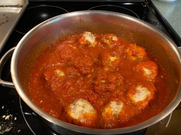 I’m always on the lookout for a good meatball recipe and this is a good one. I like the fact that it uses ground pork but in the recipe it states you can substitute ground chicken as well. My husband loves these and I think the ricotta is the winning ingredient here. They are very large meatballs but very tender. Do not over mix.