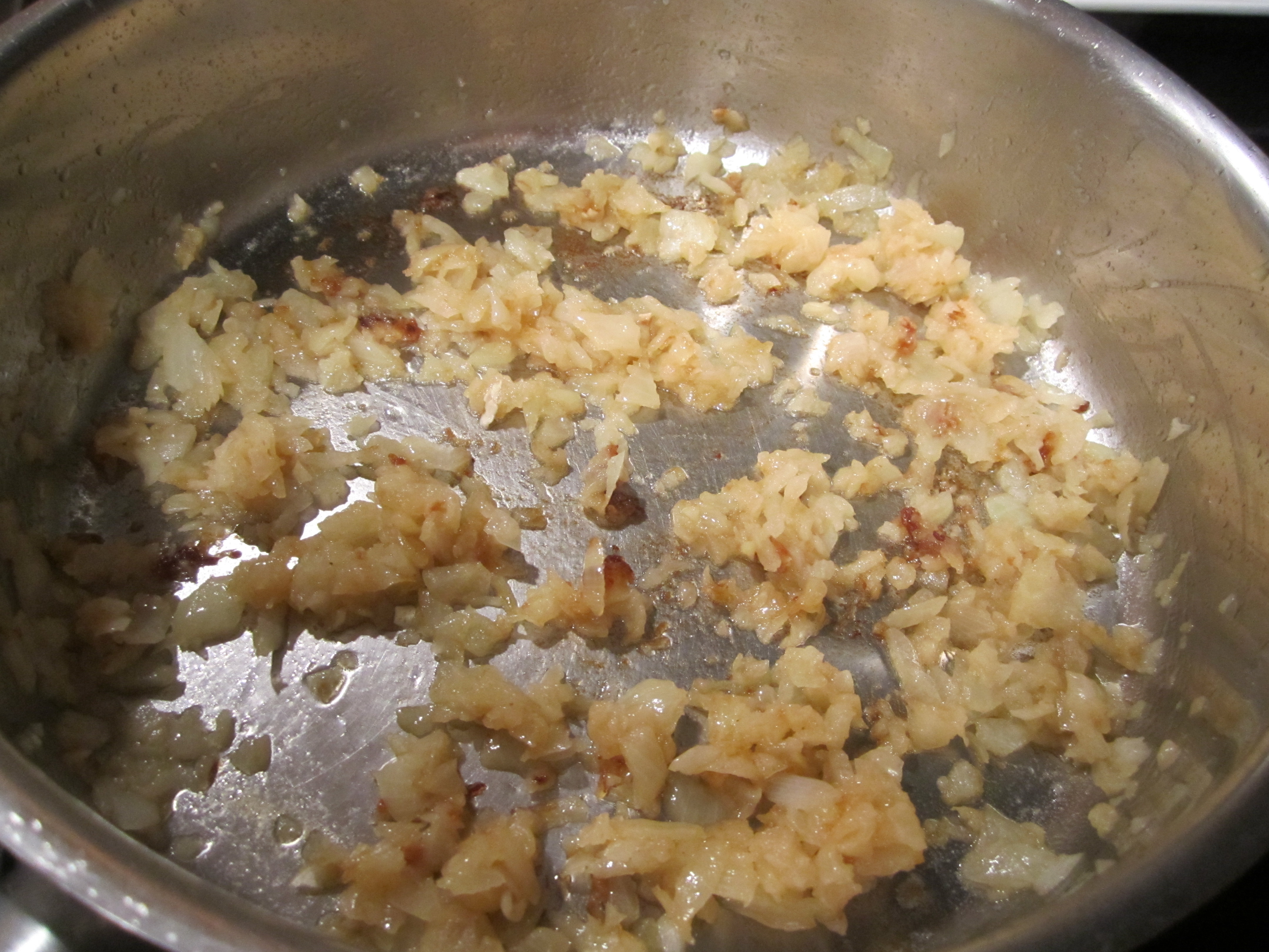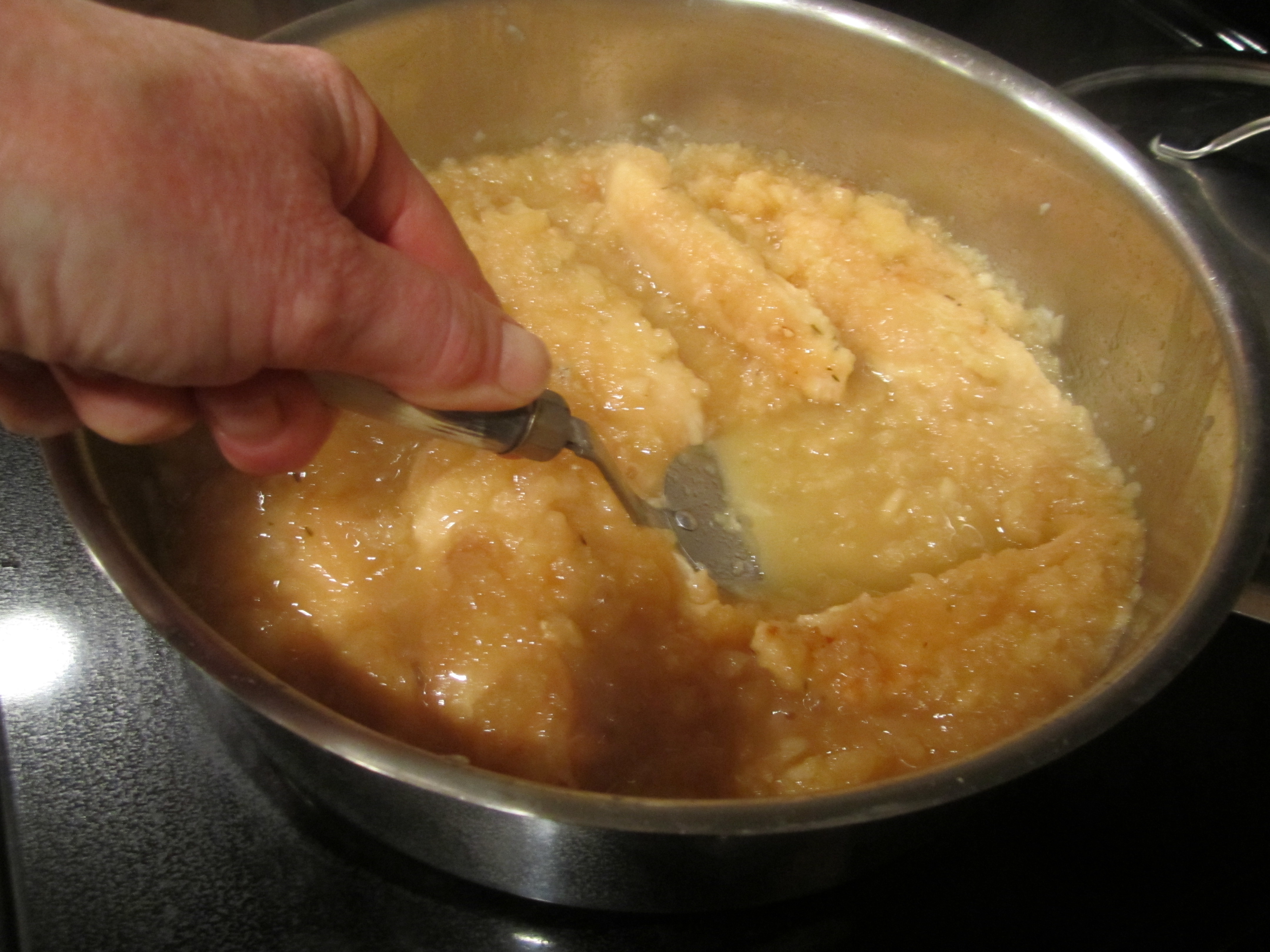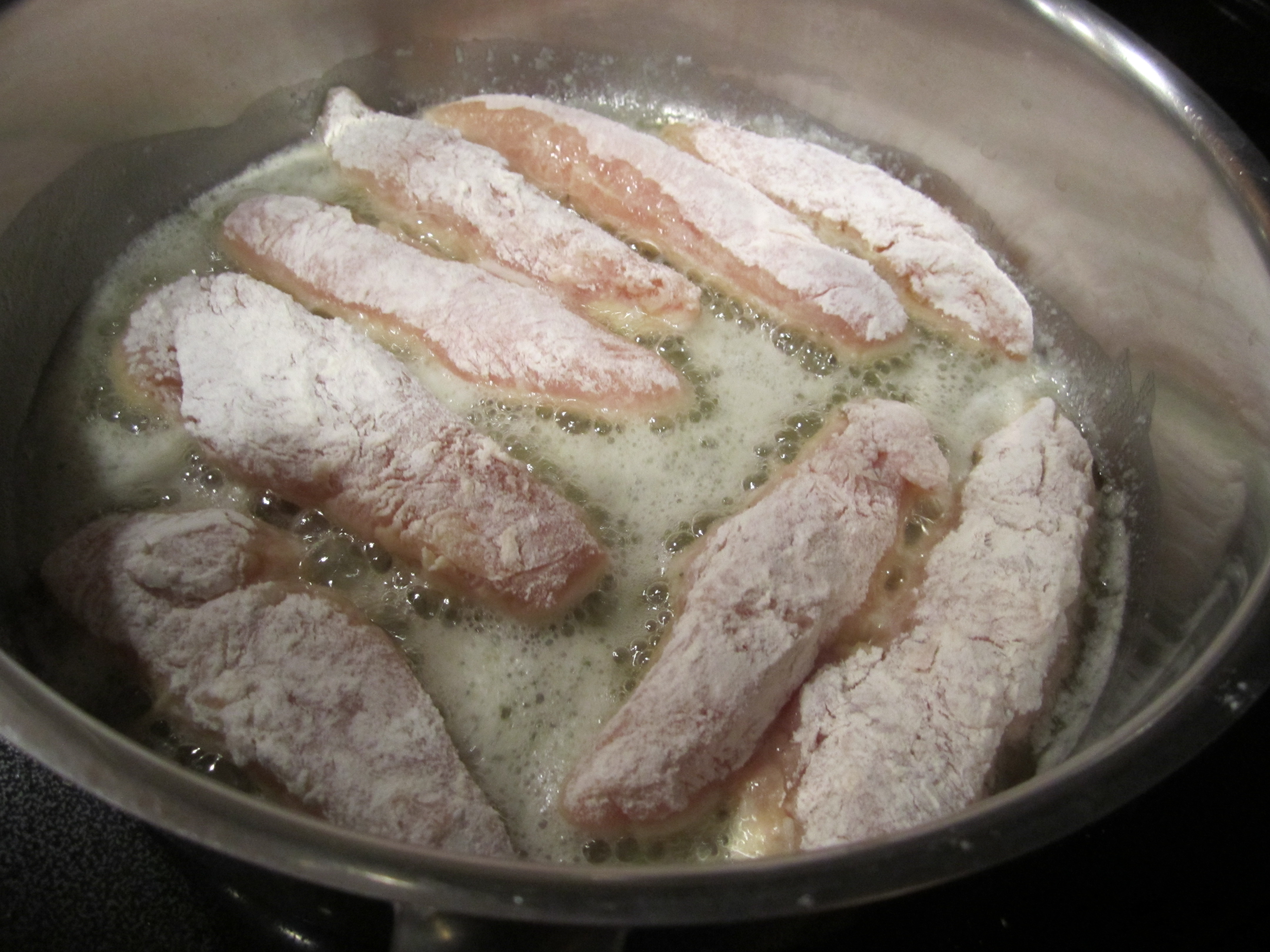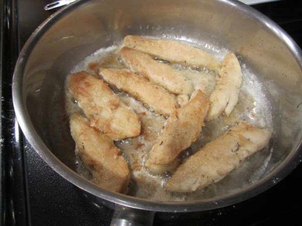 Finely chop the onion and set aside. Cut apples into 4 wedges, peel and core. Finely chop by hand or with the Cuisinart Mini-Prep. Finely chopping the apples is important. They need to cook quickly because the chicken tenders cook in no time at all. Set aside the chopped apples. Put frozen concentrated apple juice in glass measuring cup and add water. Stir to dissolve and set aside. In a plastic bag, put flour and thyme. Prepare chicken tenders by cutting the white ligament out (see post Chicken Tender). Put chicken in bag and toss to coat thoroughly.