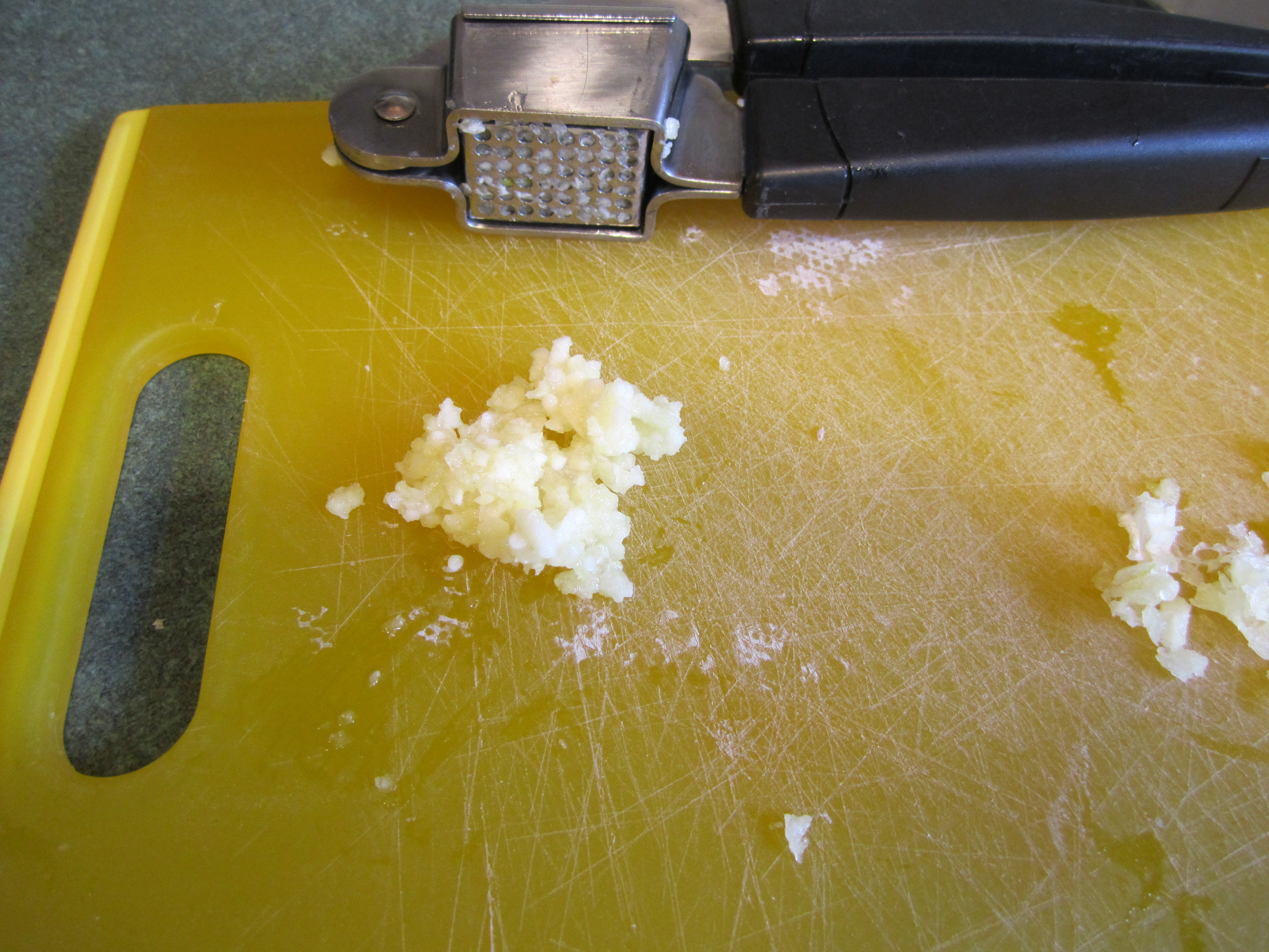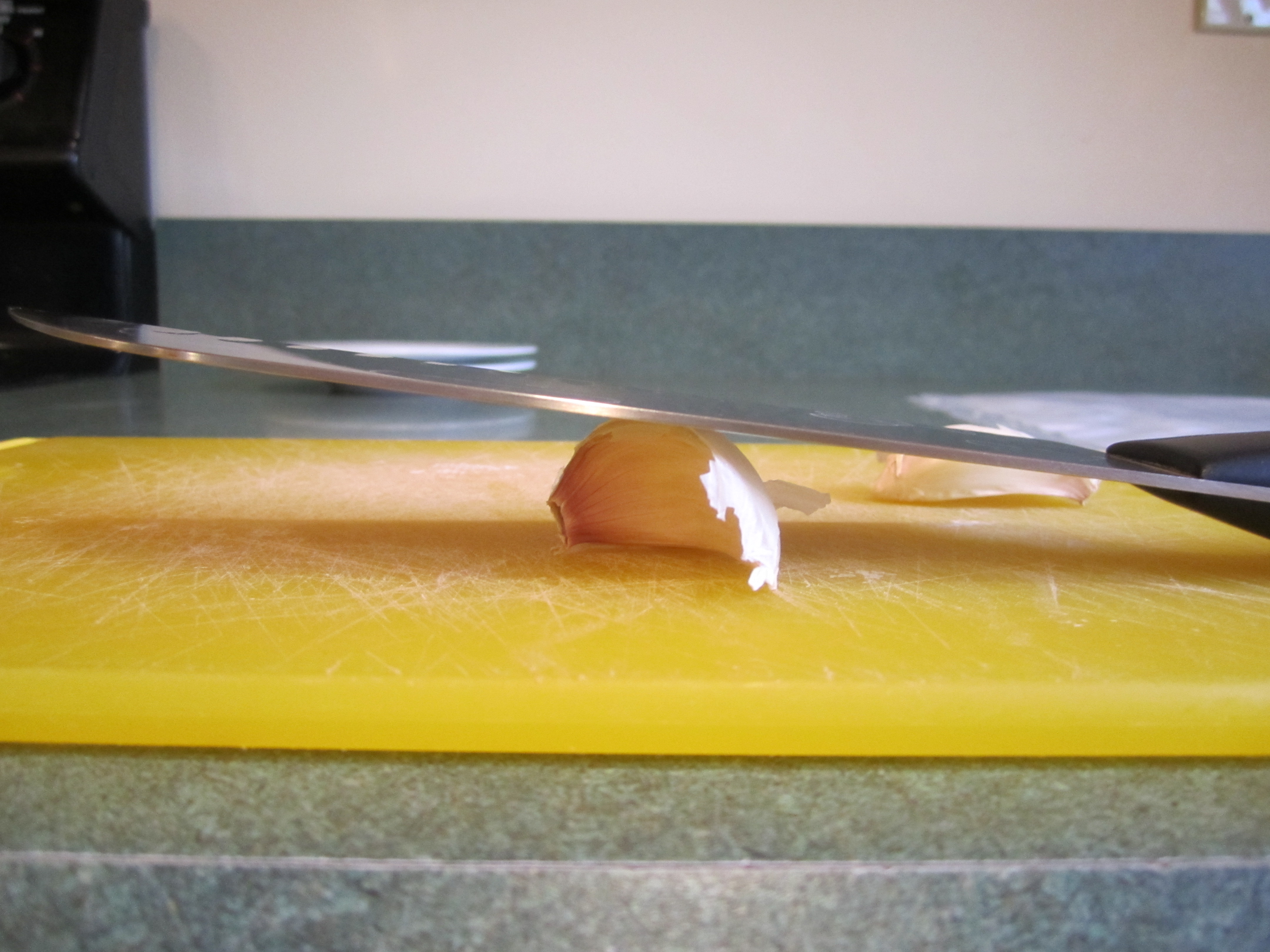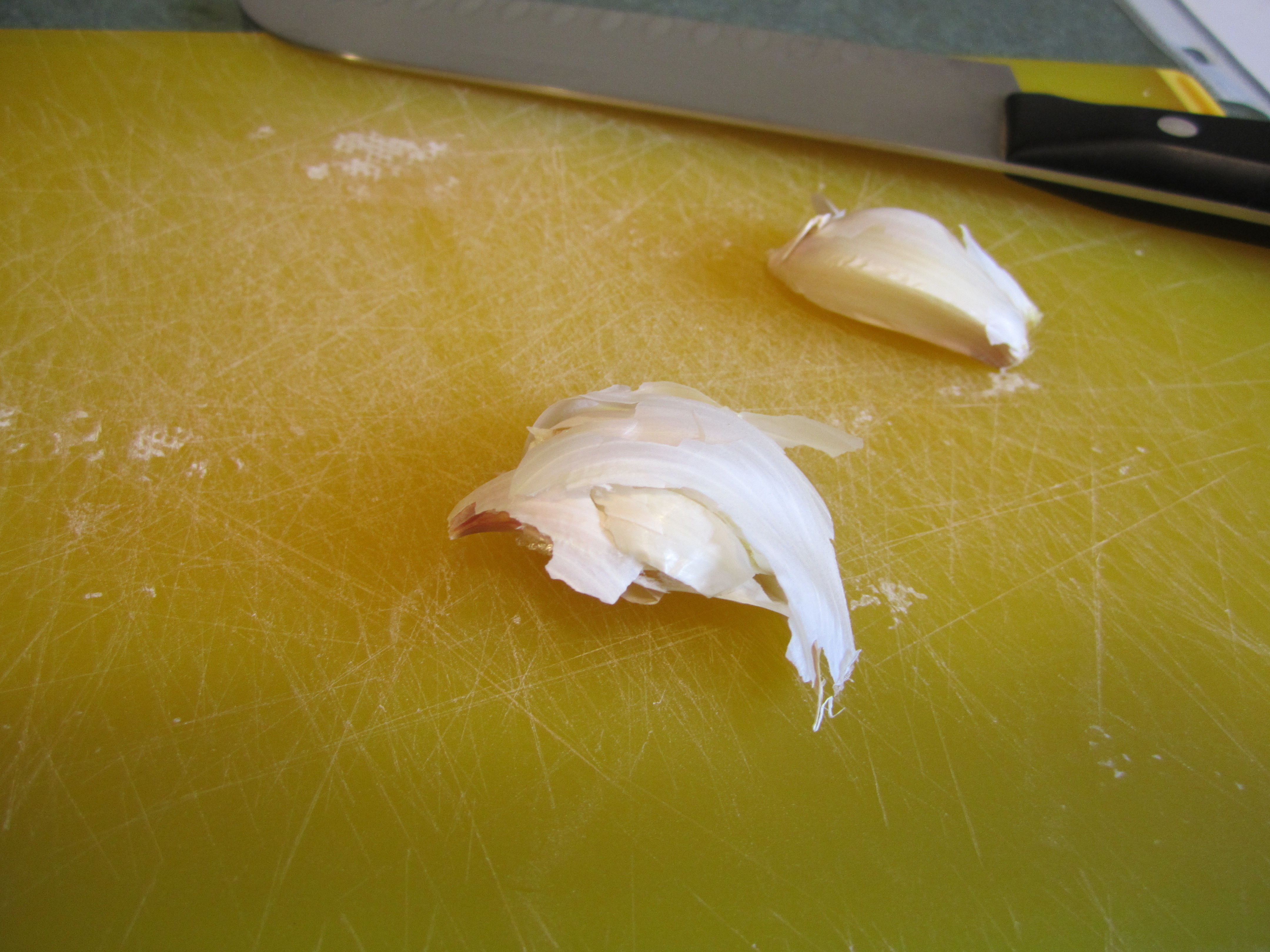 This is a simple way to peel garlic: take the clove and smash it with the side of a knife. The skin falls off and viola!, a peeled garlic clove, ready to be minced: