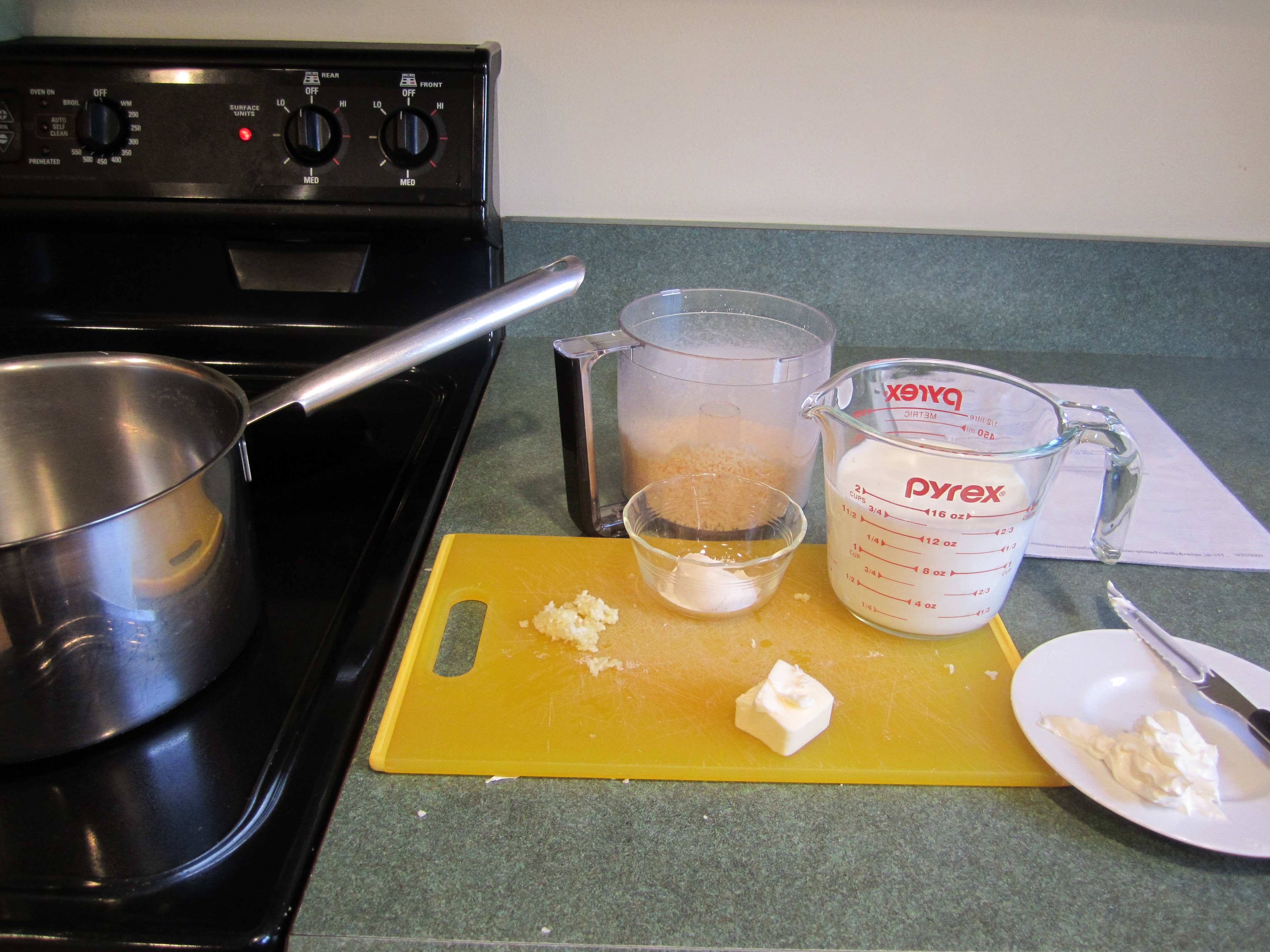 Melt butter in a medium saucepan over medium heat. Add garlic and cook one minute stirring constantly. Stir in flour and incorporate thoroughly with butter and garlic mixture. Gradually add milk, stirring with a whisk, making sure everything is combined. Bring milk mixture to a simmer and simmer for 6 minutes, (this is important, it might take 6-8 minutes to bring it to a simmer over medium heat but don’t rush it by turning up the heat) stirring frequently (just leave the whisk in the pan), it will become slightly thickened. Turn off heat and add grated cheese and cream cheese and stir constantly until melted. Pour over Fettuccine, stir to combine and serve IMMEDIATELY. (Everyone should be waiting in the background with their dishes, ready to be served. It doesn’t do well to sit in the pan too long. So tell everyone: chop, chop, dinner is ready!!)