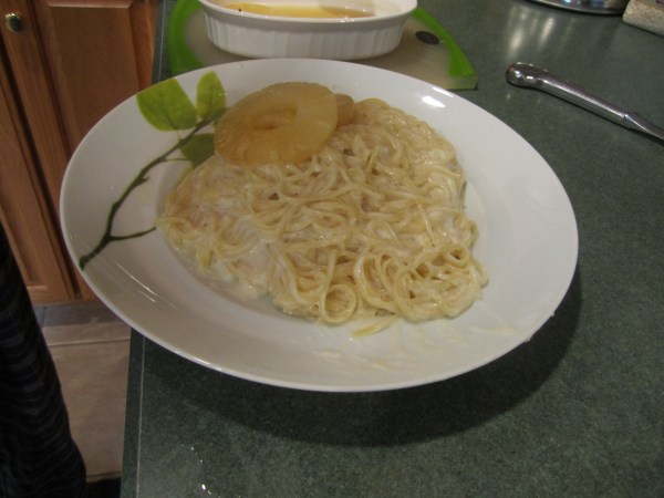 Served over Linguine Fini with baked pineapple and brown sugar (my son’s request):