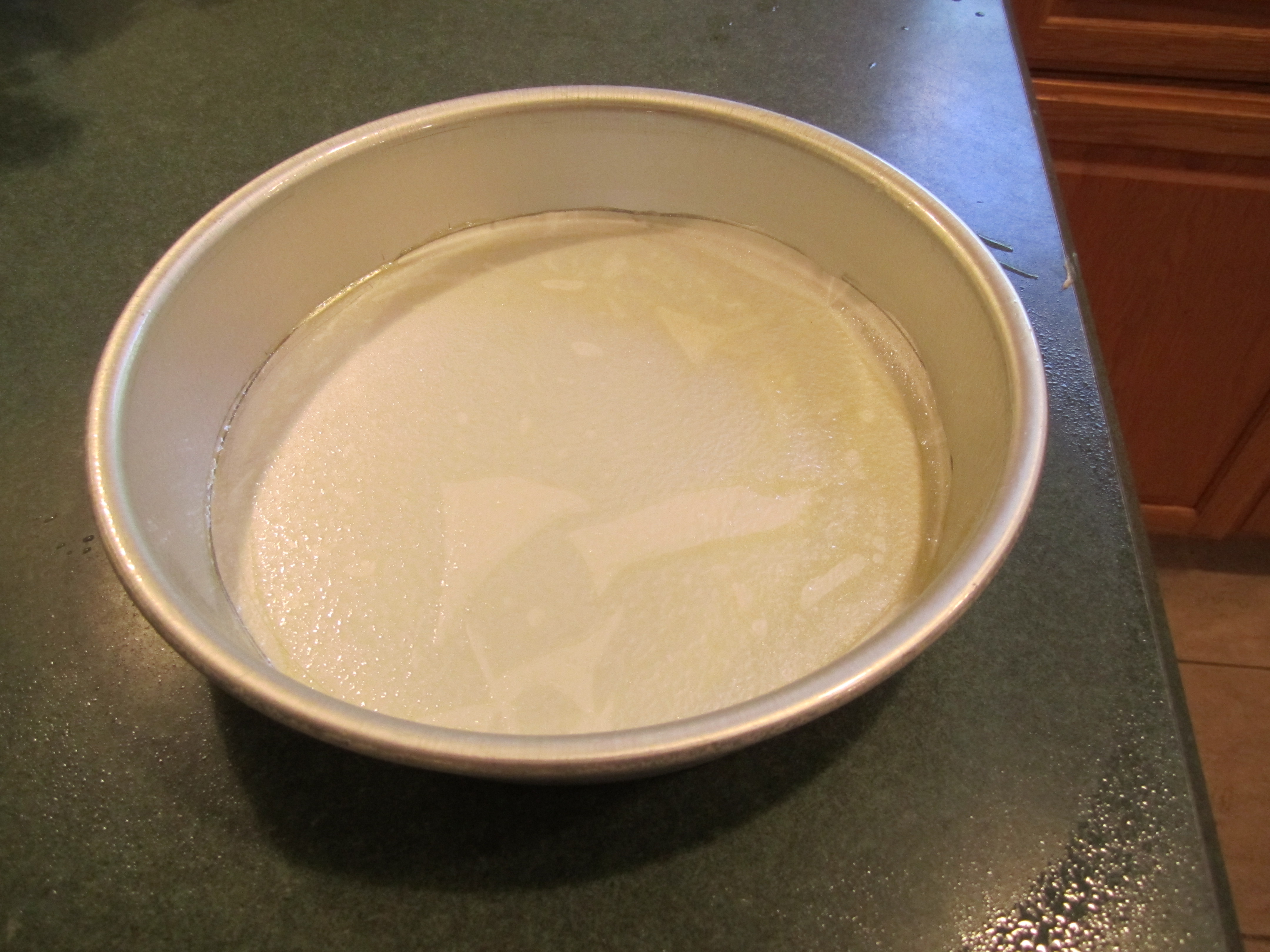 Regular 9 inch cake pan, prepped with wax paper round and sprayed with canola oil:
