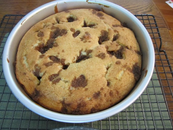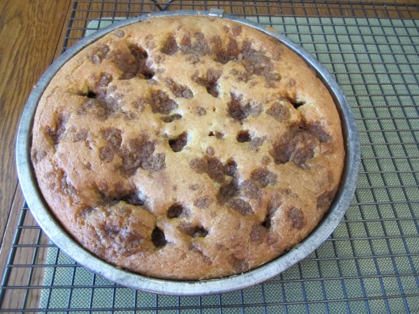 It’s a simple coffee cake, not too many bells and whistles (no nuts, apples, dried fruit, etc.) and one that uses an unusual pan. (This is exactly the pan that I have which used to be my Mom’s.) I believe the recipe is from the original Betty Crocker Cookbook. The pan and dividing the streusal in half (half in middle, half on top) is my mom’s idea.