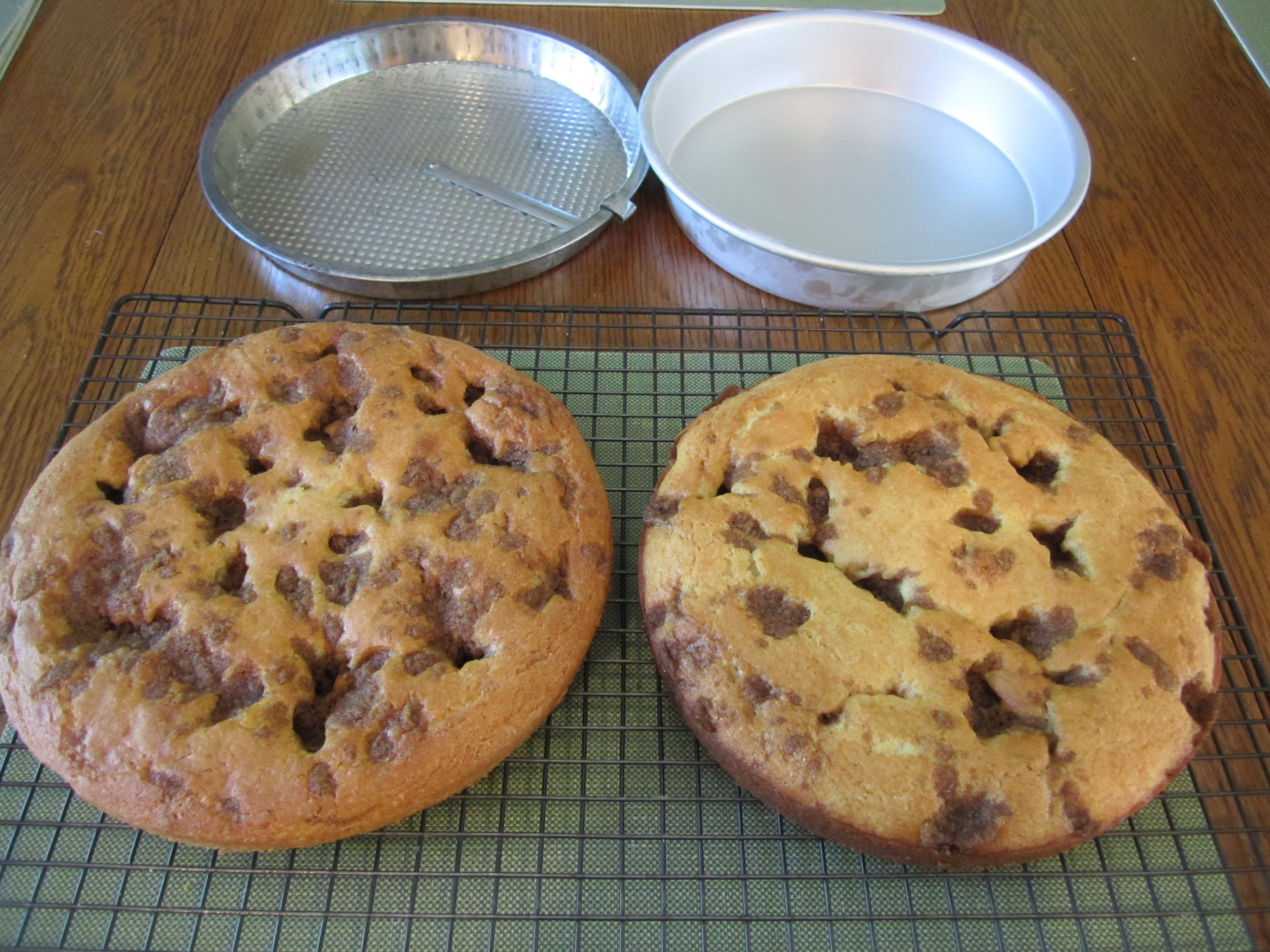 Well, these are the results: I like the cake better with the cake pan that had the cutter. It tasted more like my Mom’s. My only conclusion is that the cake pan with the cutter is not as deep and is slightly larger in diameter. As you can see from the picture of the cakes side by side, the cake with the cutter is slightly more brown. I really wanted to say that it doesn’t make a difference but it does, according to my perfecting deliciousness taste buds. So, it might be worth buying this very specific pan.
