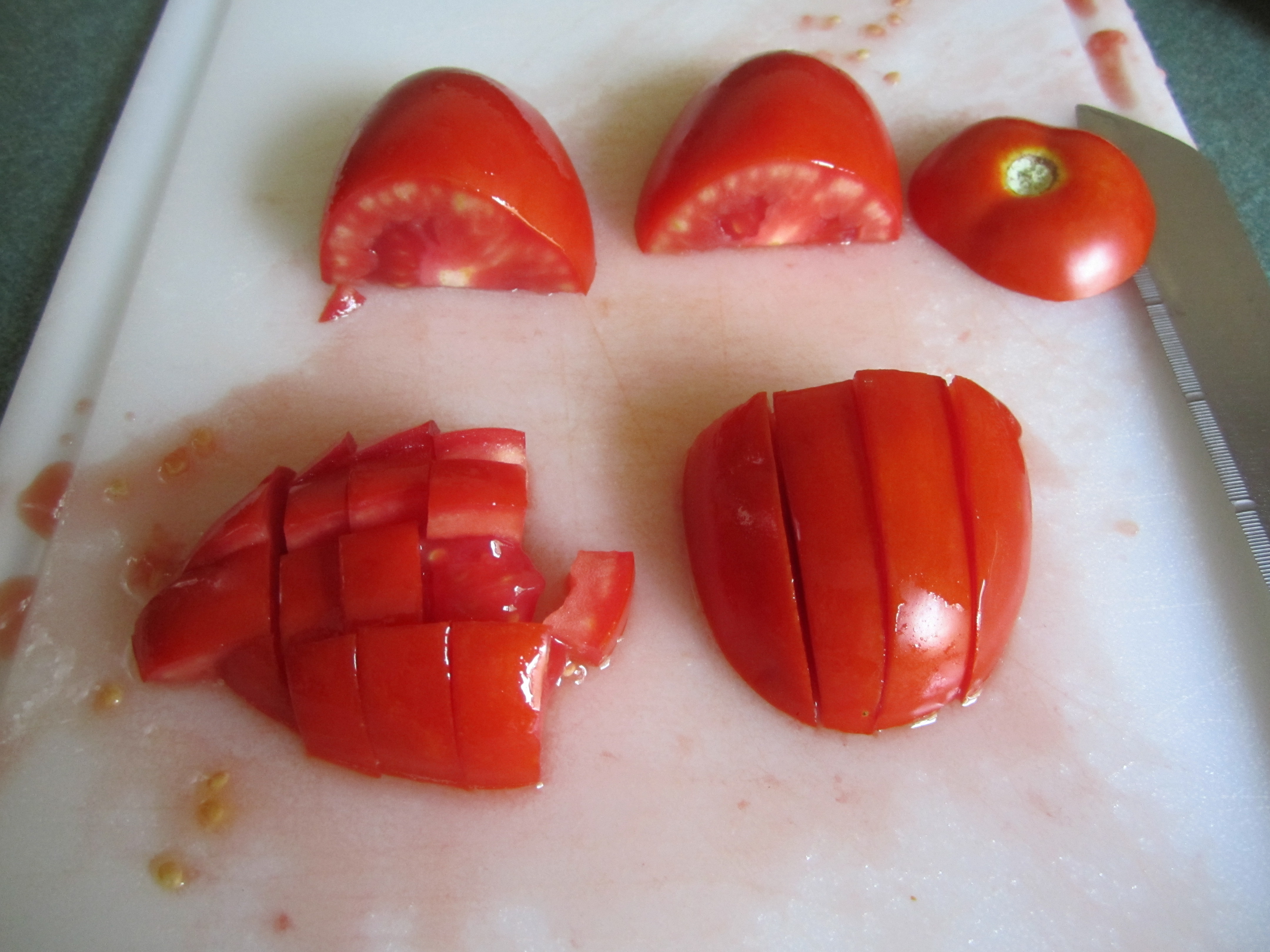 cut tomatoes: I use a fine edged bread knife