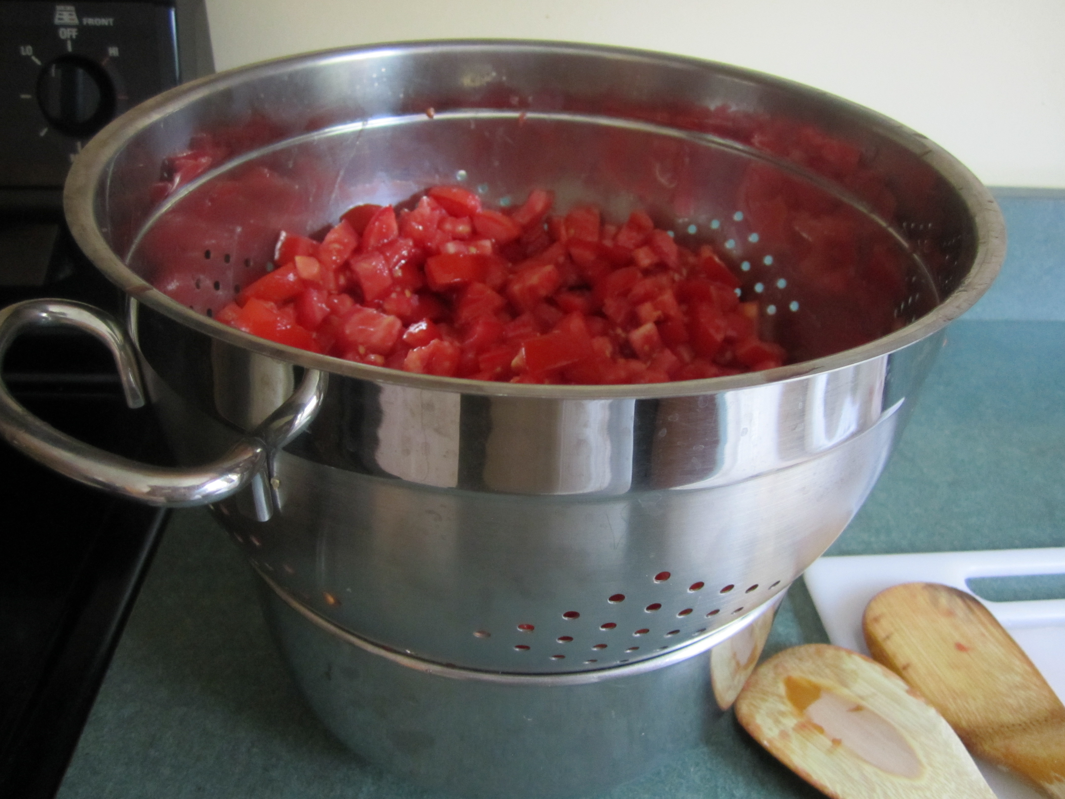 tomatoes draining over a bowl: