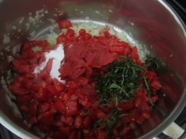 Melt butter in large saucepan, over medium heat.  Add olive oil.  Chop onion and garlic (together in the Cuisinart Mini Prep Plus, if you have one) and put in saucepan.  Saute for 10 minutes until soft and translucent.  Add drained tomatoes, fresh basil, tomato paste and sugar.  Let simmer at medium heat for 15 to 20 minutes.  Sauce will thicken slightly and there will still be chunks of tomatoes.  Season with salt, if needed.  (mine needed an extra 1/4 teaspoon, today).