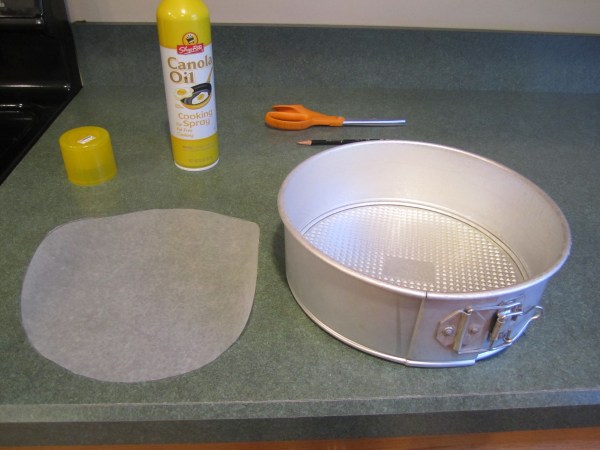 canola oil sprayed springform pan and wax paper round ready to go in: