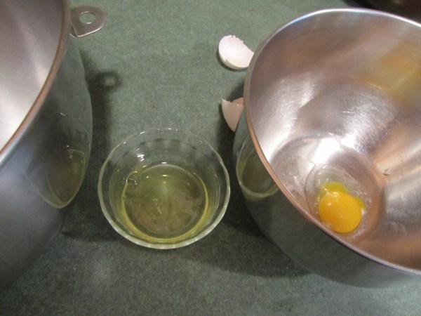 Since this recipe has no leavening (baking soda or baking powder) it’s relying on the egg whites to do the job. To help you understand about folding egg whites (very difficult to show in pictures or describe in words) watch this video from Alton Brown. At about the 58 second spot he starts folding and that’s what I want you to see. I don’t agree that the eggs need to be that stiff. You will see in the picture below the consistency of the egg whites that I like. And I think the use of multiple bowls is a little excessive.