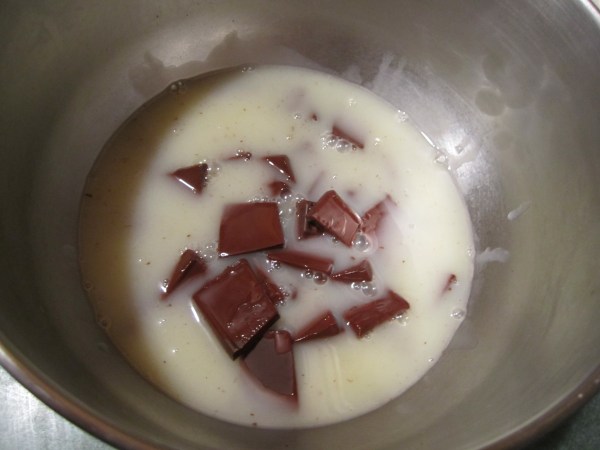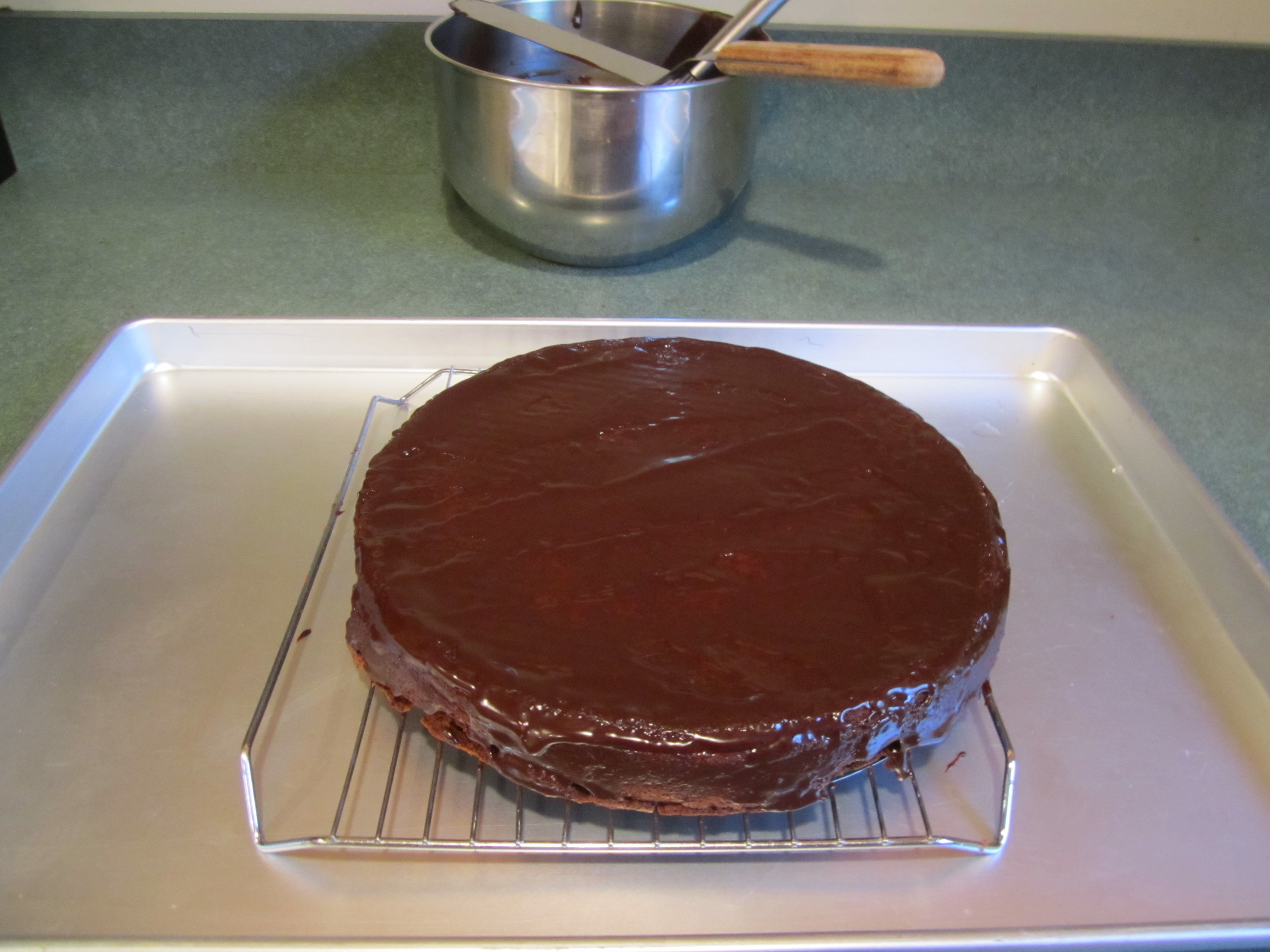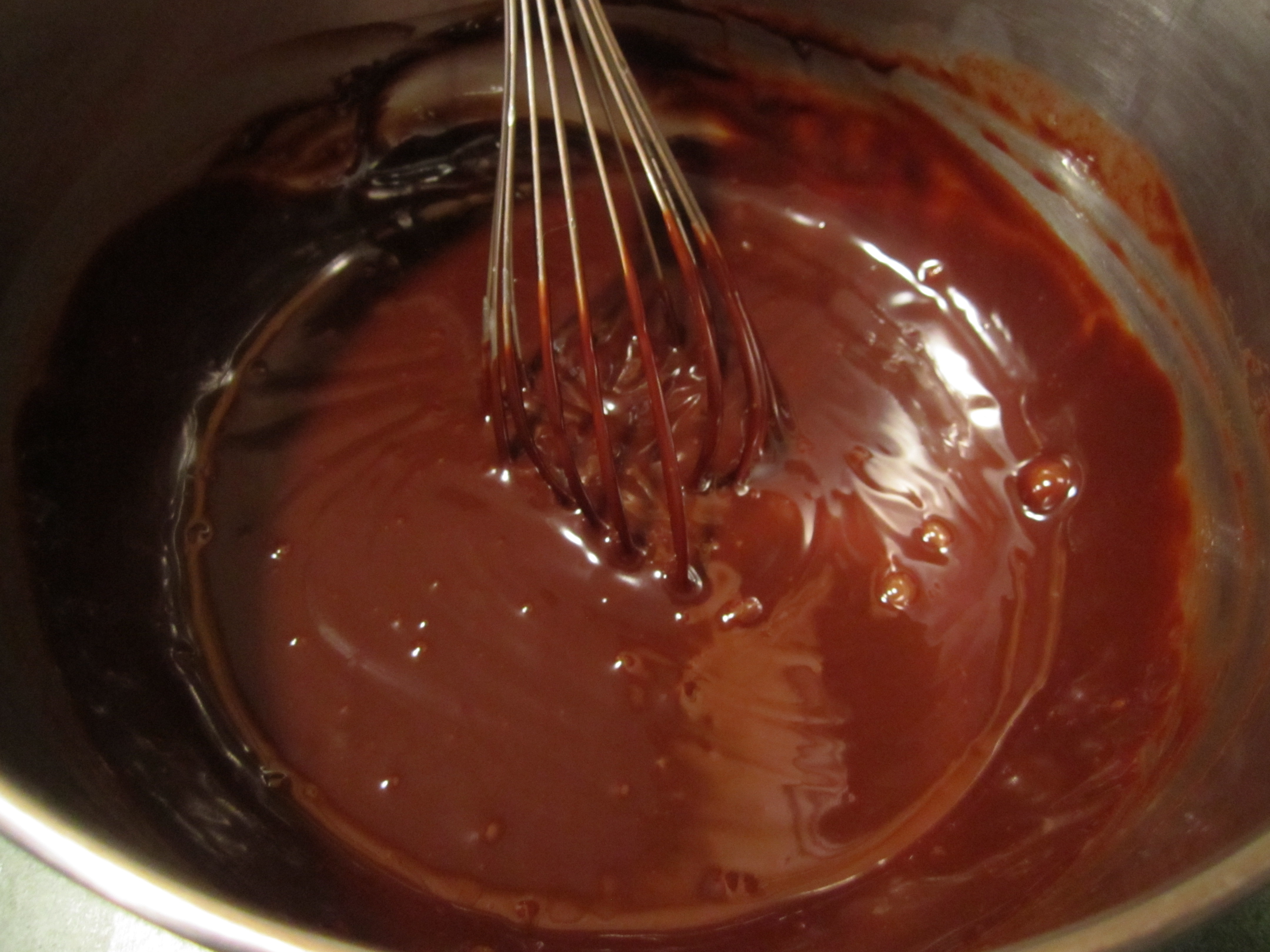 For the glaze, bring the cream and corn syrup to a simmer in a saucepan but pour it over a separate bowl that contains the 9 oz. of chopped Ghirardelli chocolate: 6 oz. semi-sweet and 3 oz. bittersweet. Let sit for one minute, then whisk until chocolate melted and mixture is thoroughly combined.