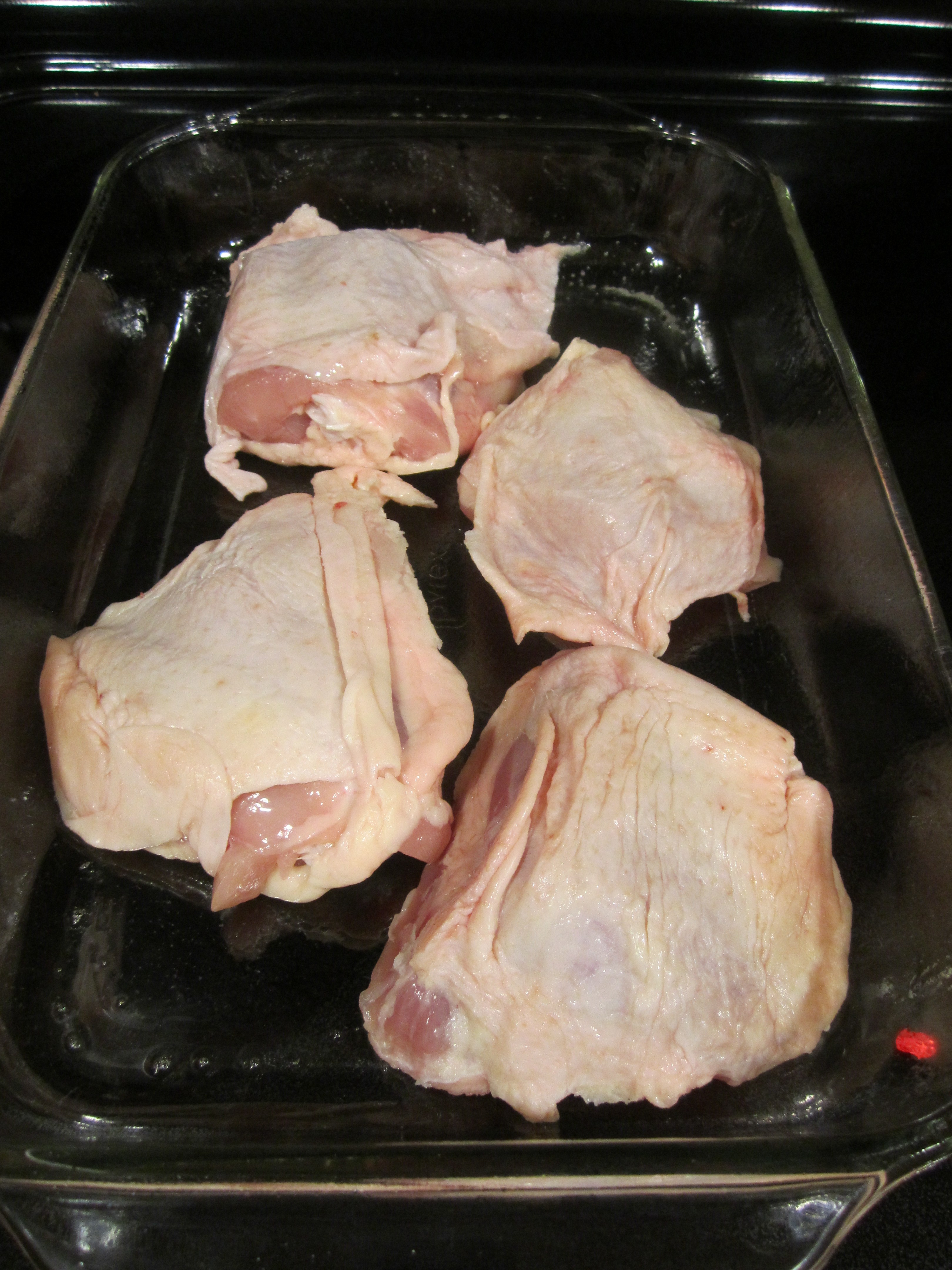 chicken thighs in 9 x 13 inch baking pan, sprayed with canola oil: