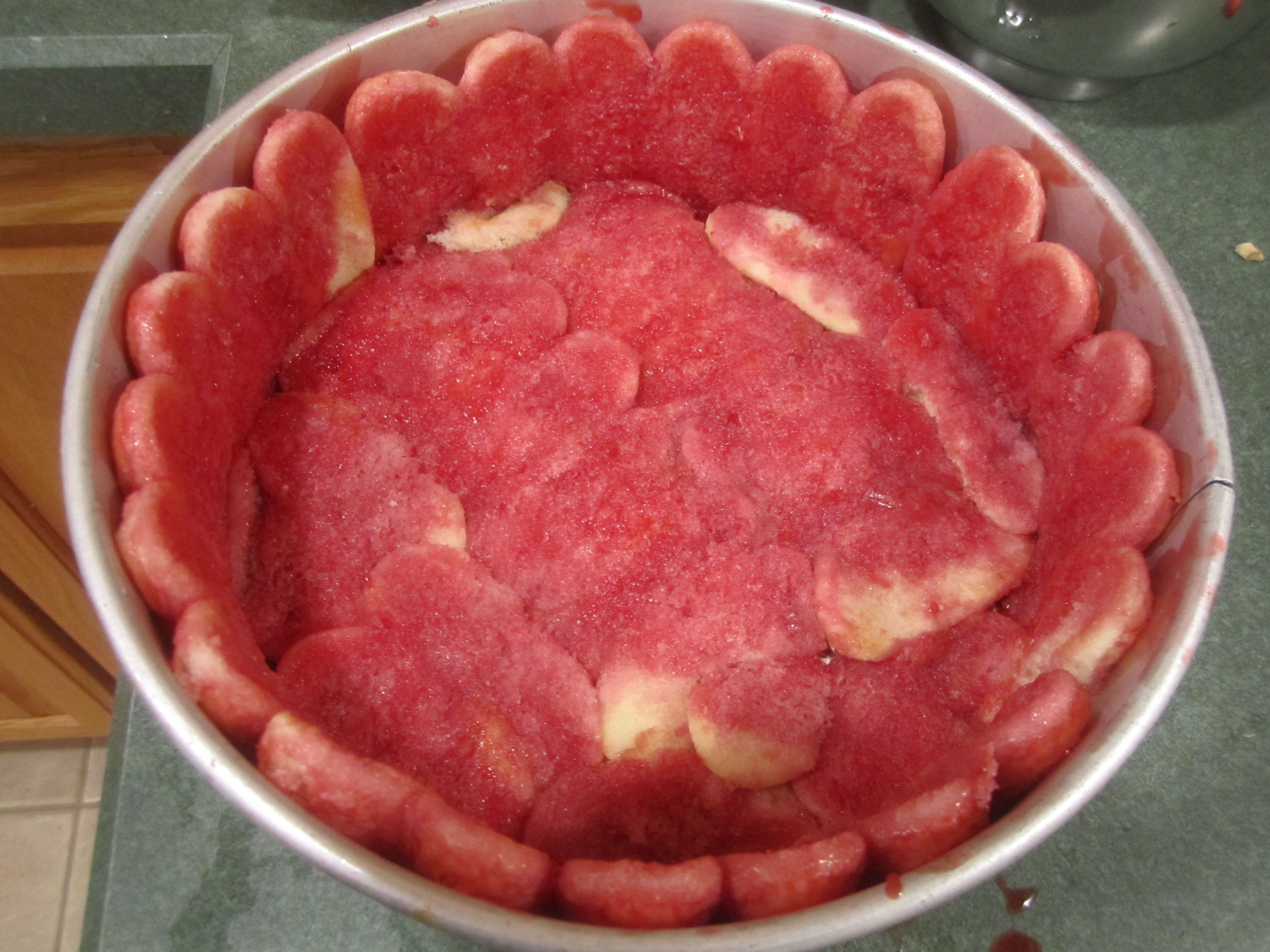 step one: raspberry soaked lady fingers on sides and bottom of pan: