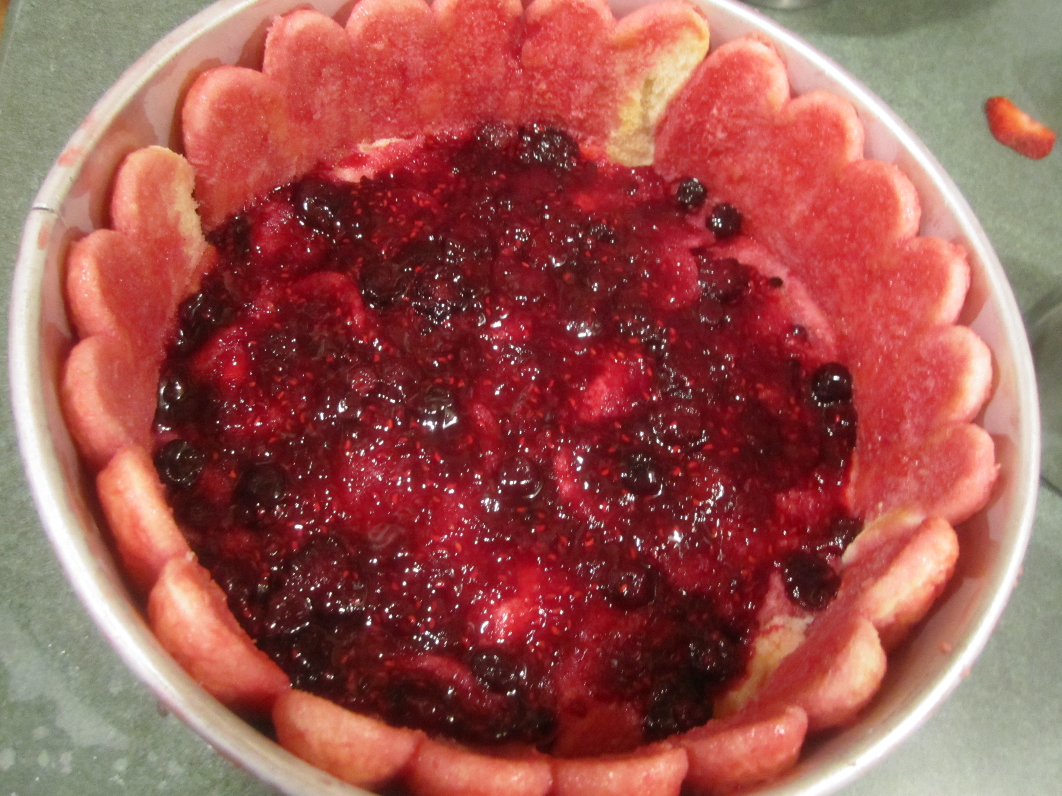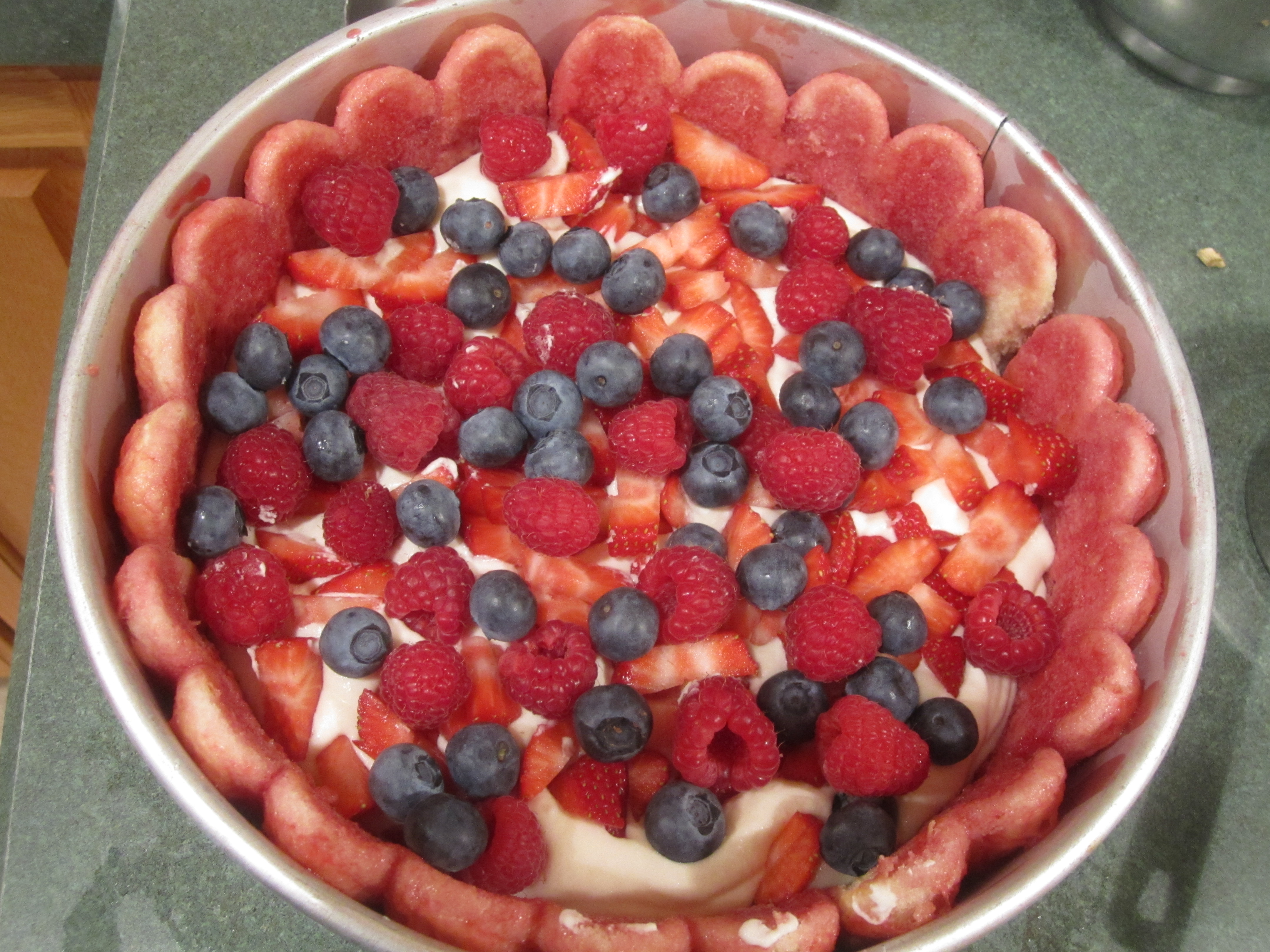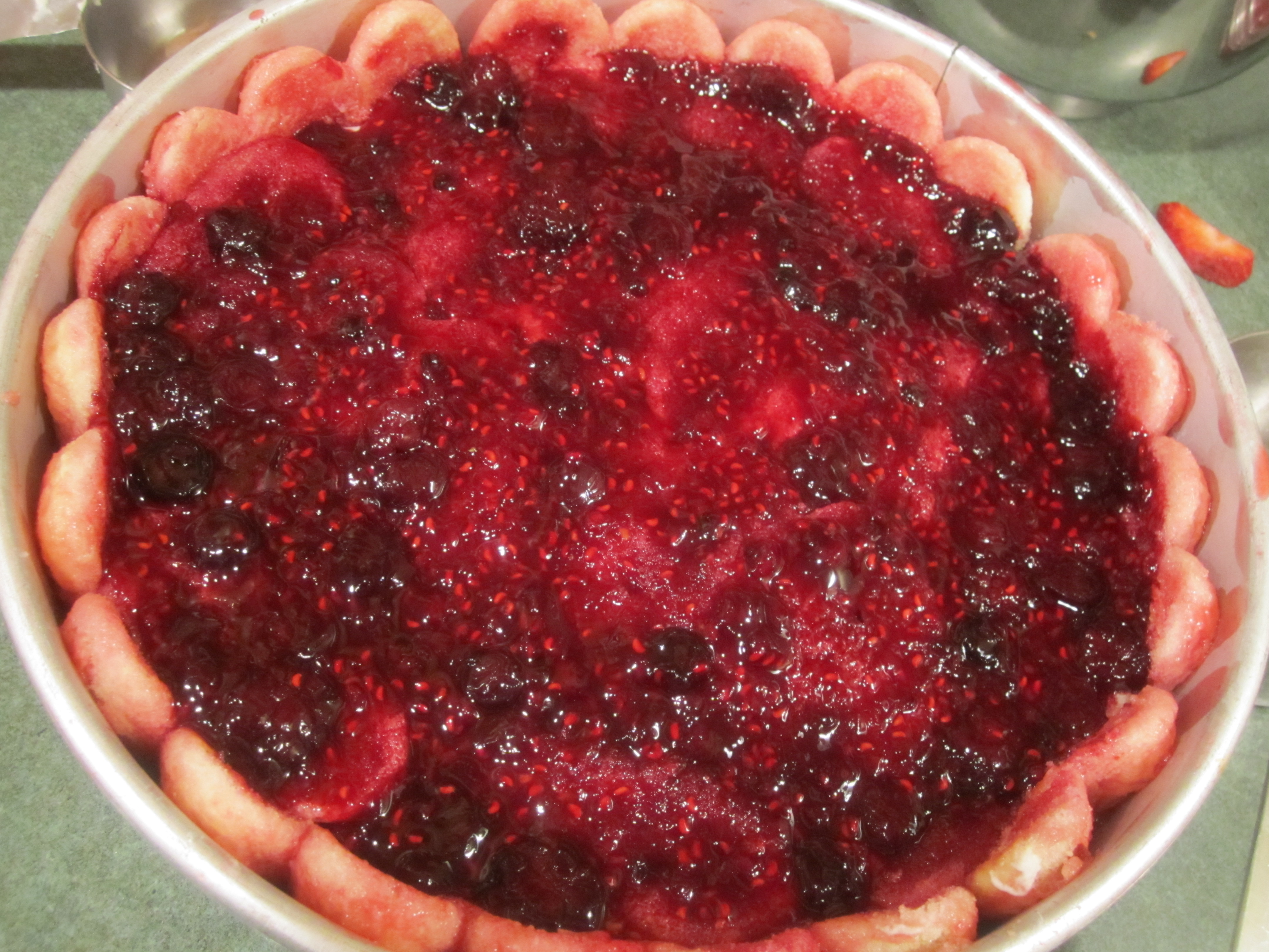 Gently spread half the jam mixture over the ladyfingers in bottom of springform pan. Spoon half the mascarpone/heavy cream mixture over and smooth the top. Sprinkle with the sliced strawberries, 1/2 of the fresh raspberries and 1/2 of the fresh blueberries. Dip more ladyfingers into the juice and arrange over the fruit in the pan, covering completely.