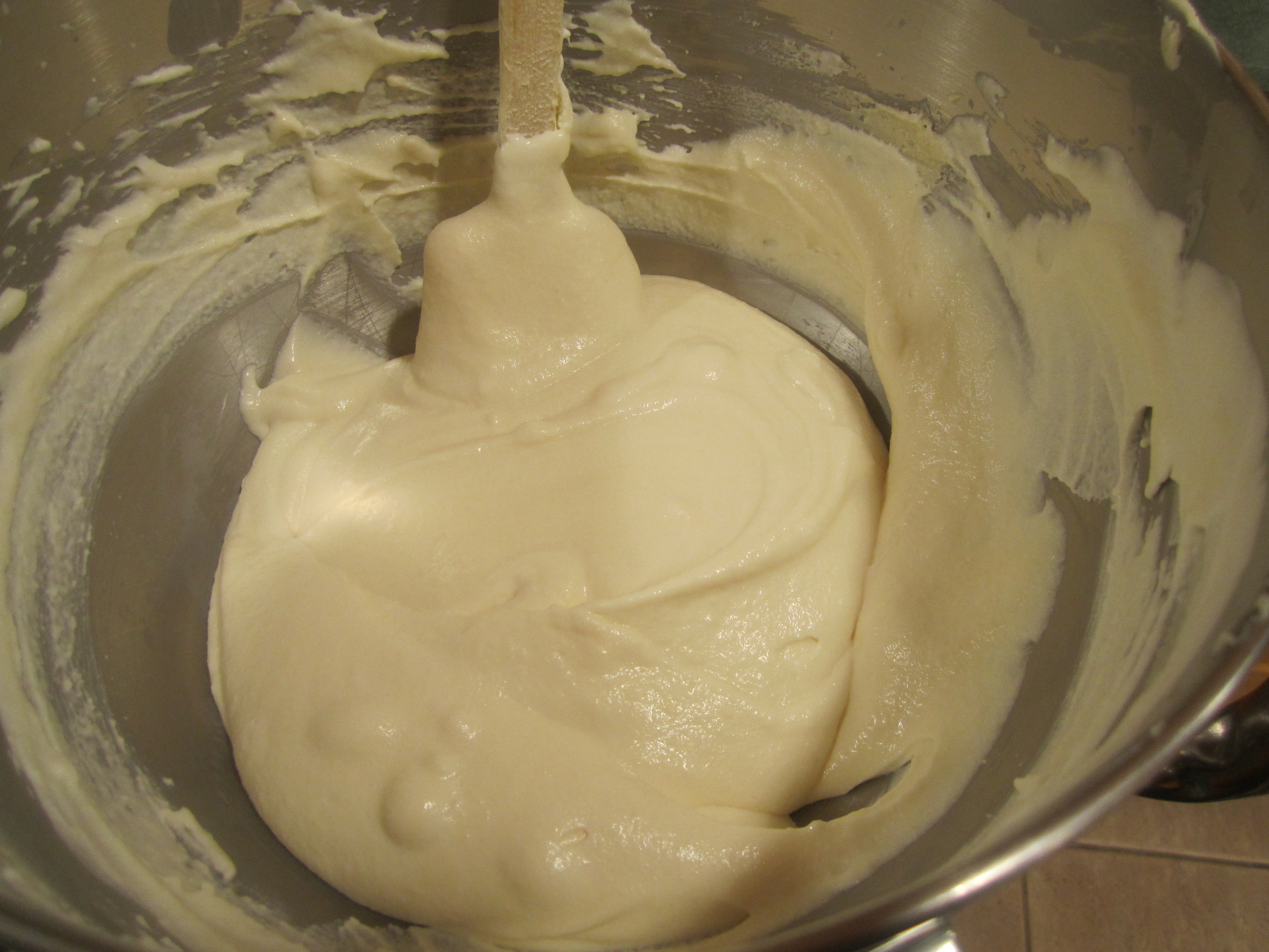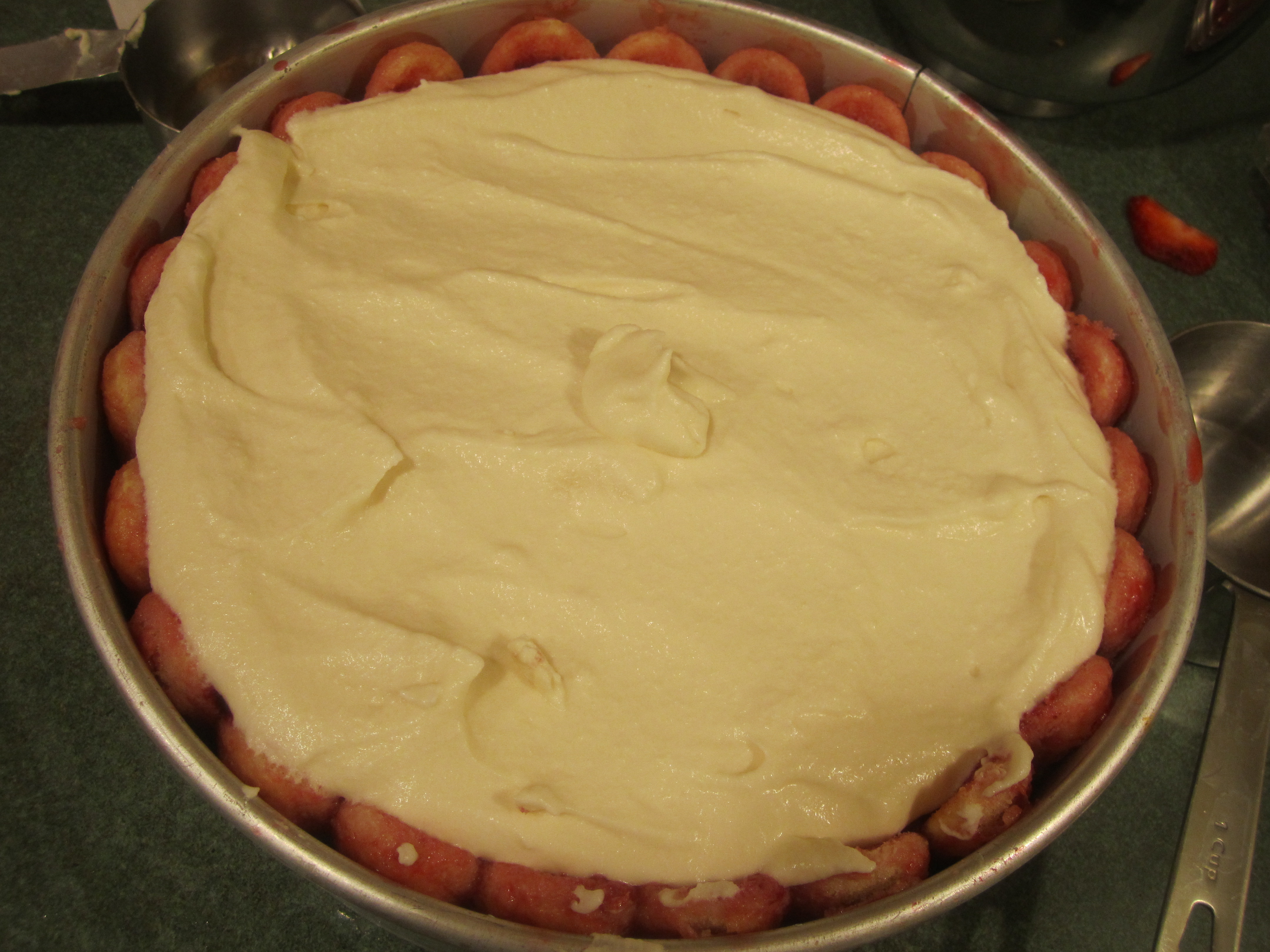 Set up your springform pan, making sure the bottom is securely in place. Unwrap your ladyfingers. Take a section of ladyfingers and dip them quickly in the juice and place on the side of the springform pan, with the flat side facing out. Continue this way until the edges are wrapped in raspberry juiced ladyfingers. Continue in the same manner with the bottom of the springform pan, covering the bottom completely. This may mean tearing up some ladyfingers to fit and squishing them in to form a pretty solid bottom of ladyfingers.