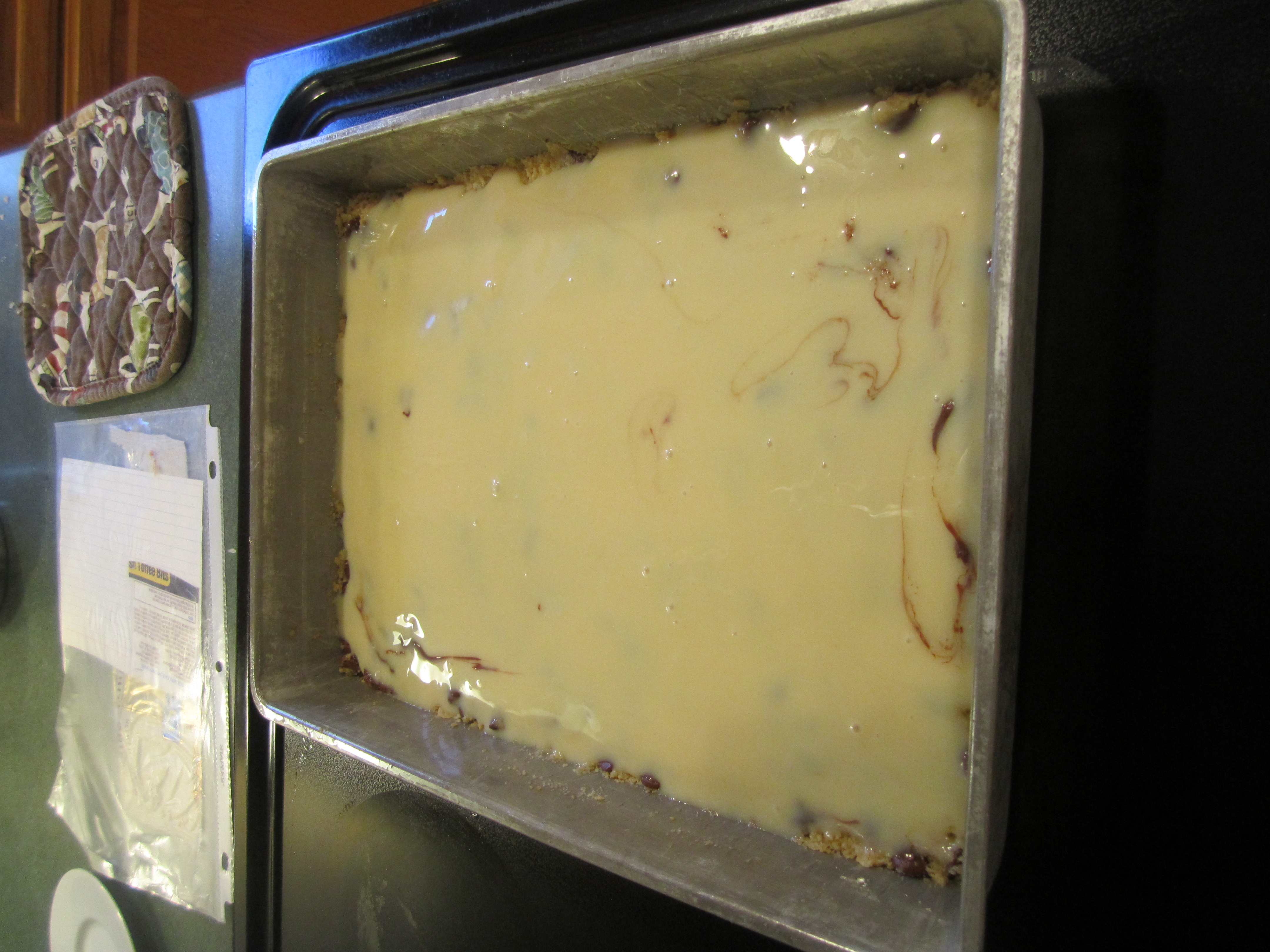 Pour sweetened condensed milk evenly over hot crust. Top evenly with 1-1/2 cups of Toffee bits. Sprinkle reserved 1-1/2 cups of crumb mixture and 1/2 cup of chocolate chips over top. Bake for 25 minutes until golden brown.
