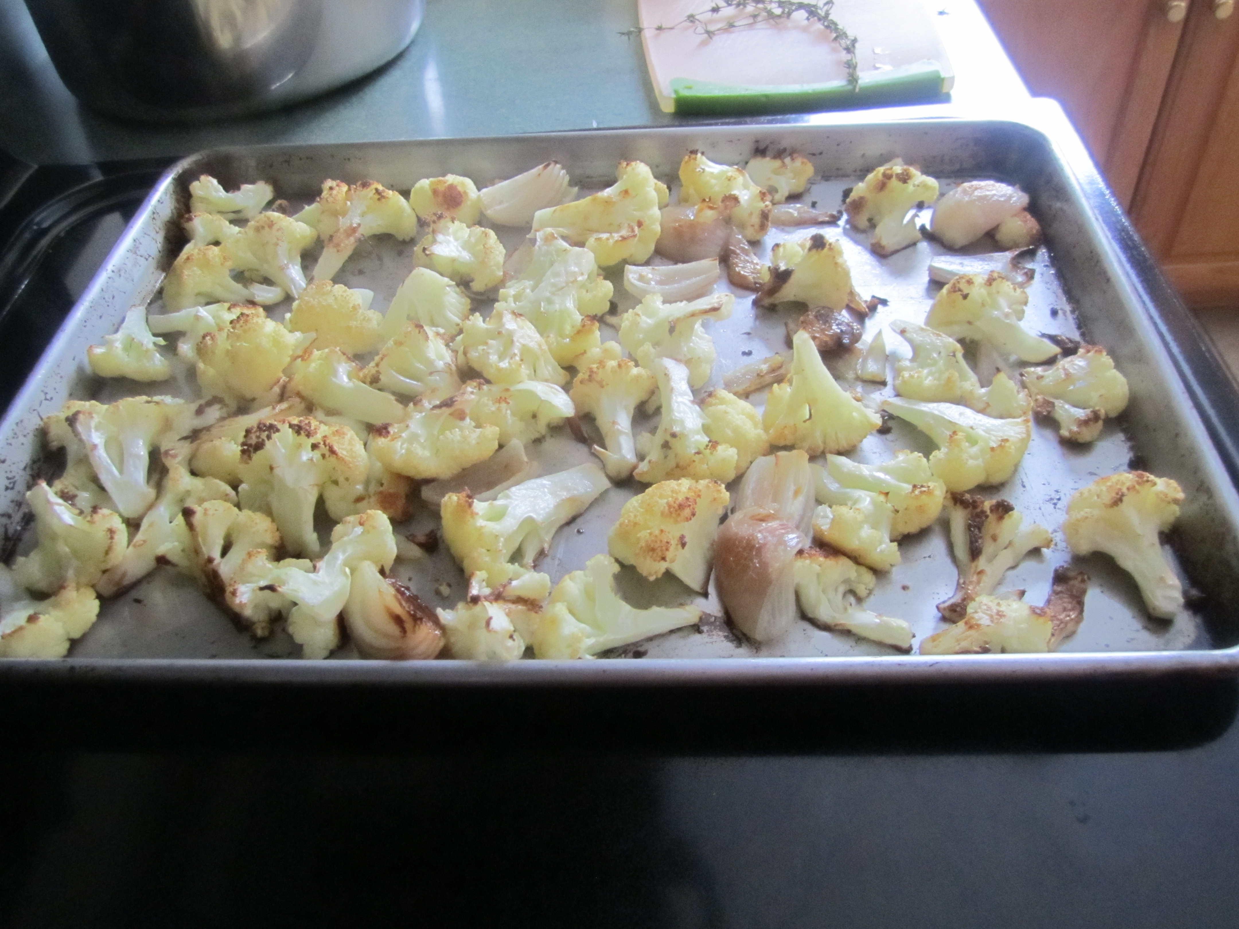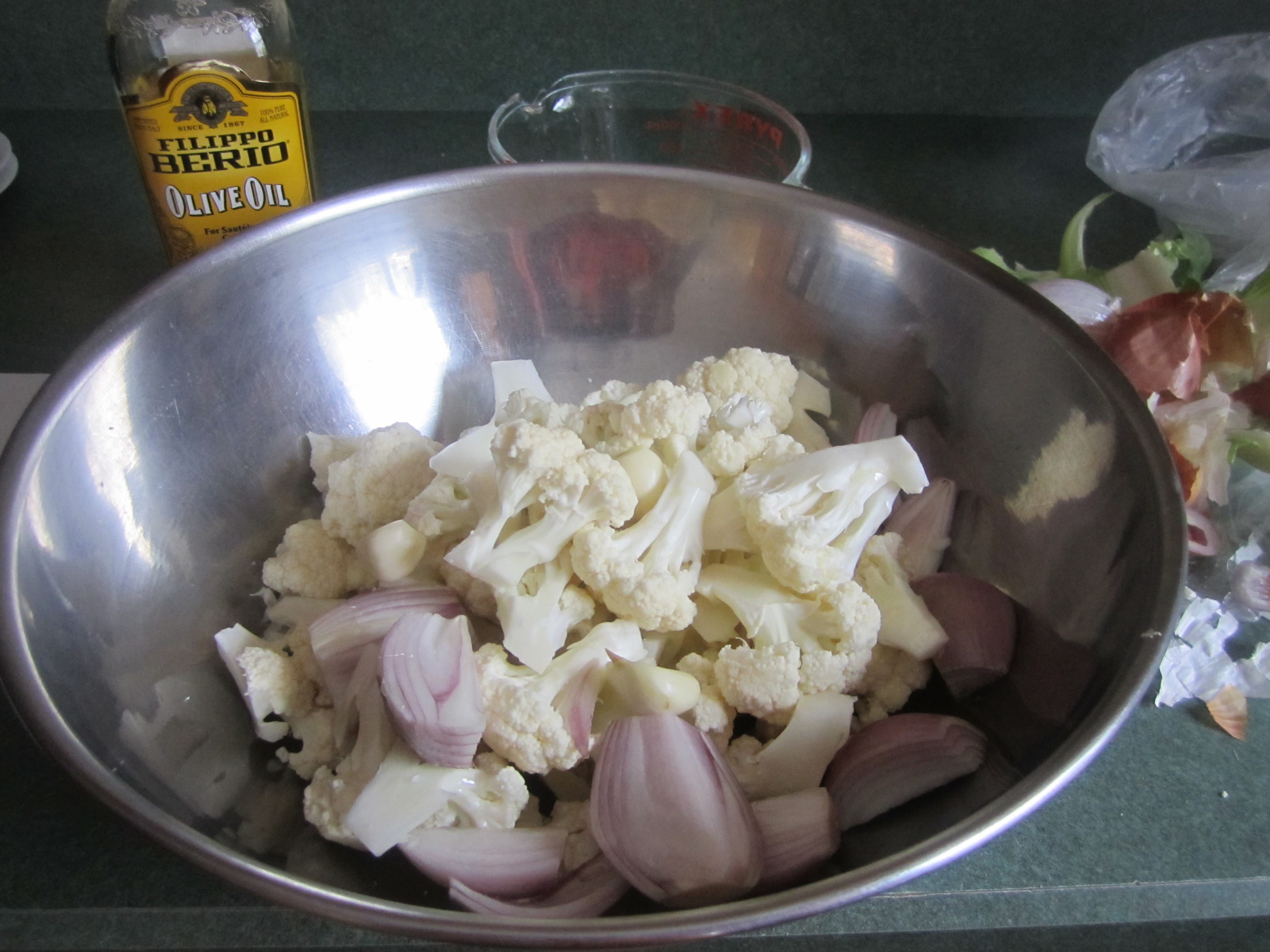 Cut cauliflower into small florets, you should have about 10 cups, and place into a very large bowl. Add garlic and shallots and toss everything together with the olive oil. Place onto a large rimmed cookie sheet, sprayed with canola oil. Bake for 30 minutes, tossing everything around a bit with a metal spatula half way through.