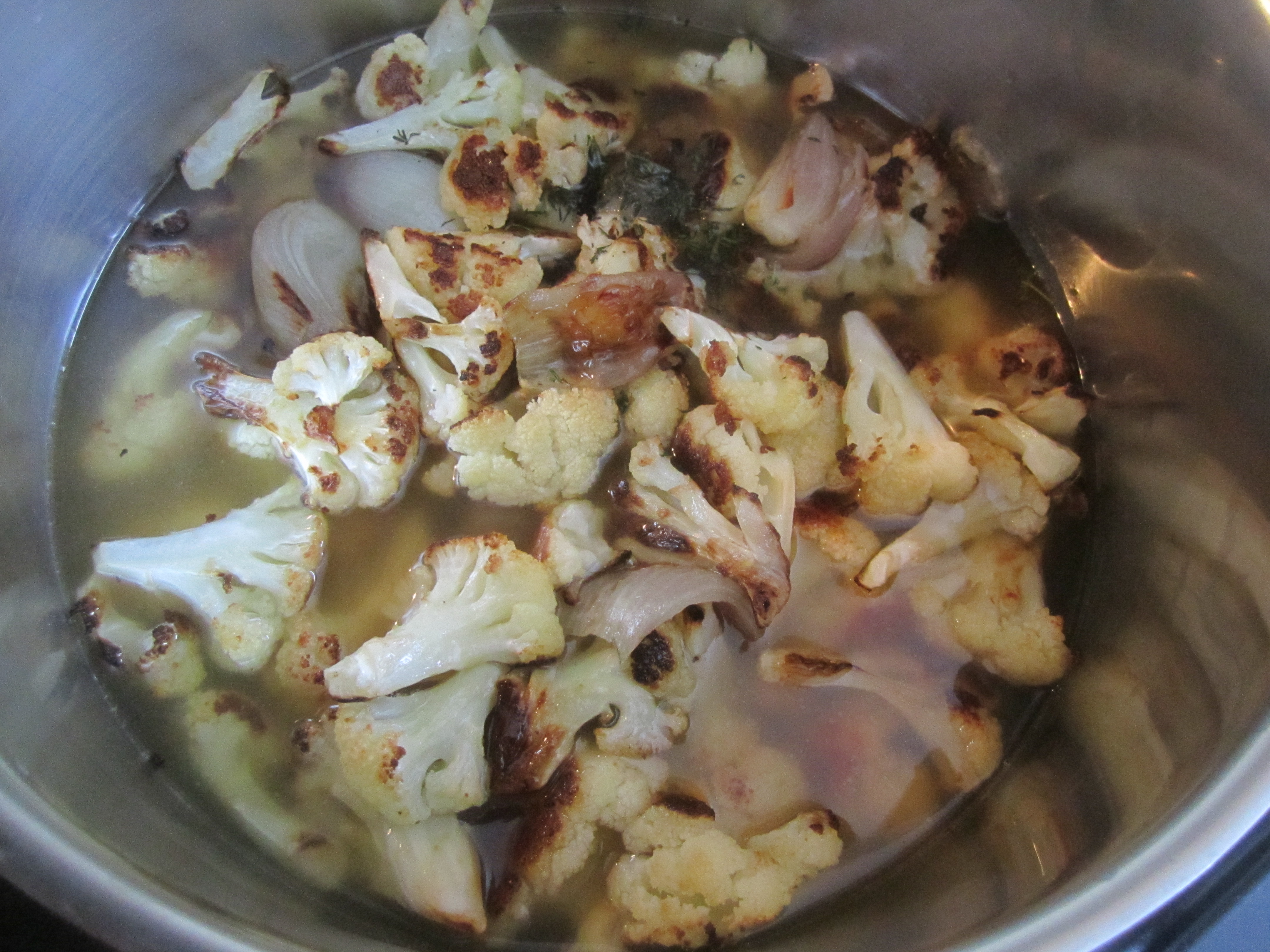 cauliflower mixture in saucepan with the chicken broth and thyme: