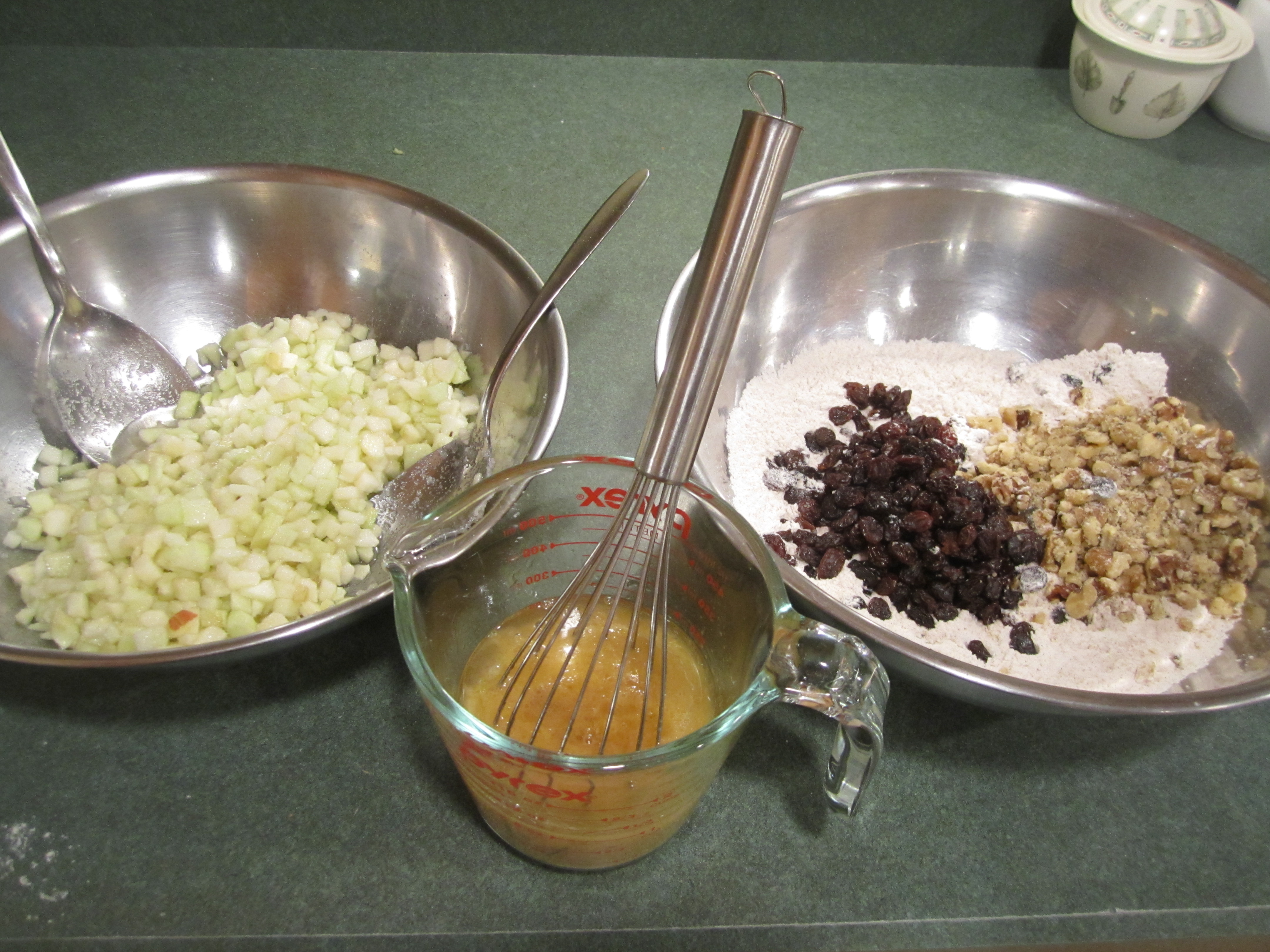 Add the raisins and walnuts to the flour mixture and stir thoroughly, breaking up walnuts and separating the raisins with your fingers.