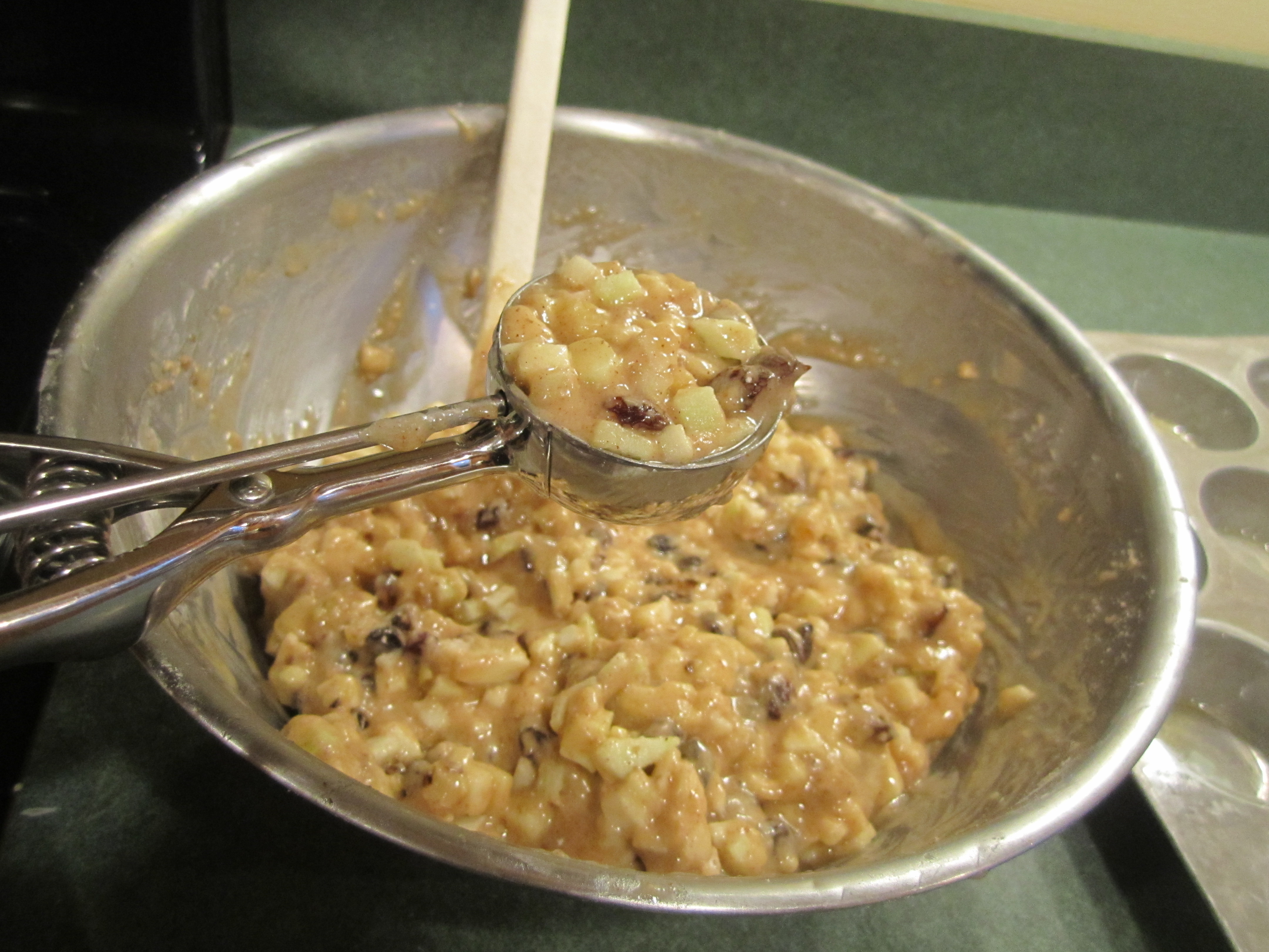 The batter is super thick so the muffin comes out packed with apples, raisins and walnuts.