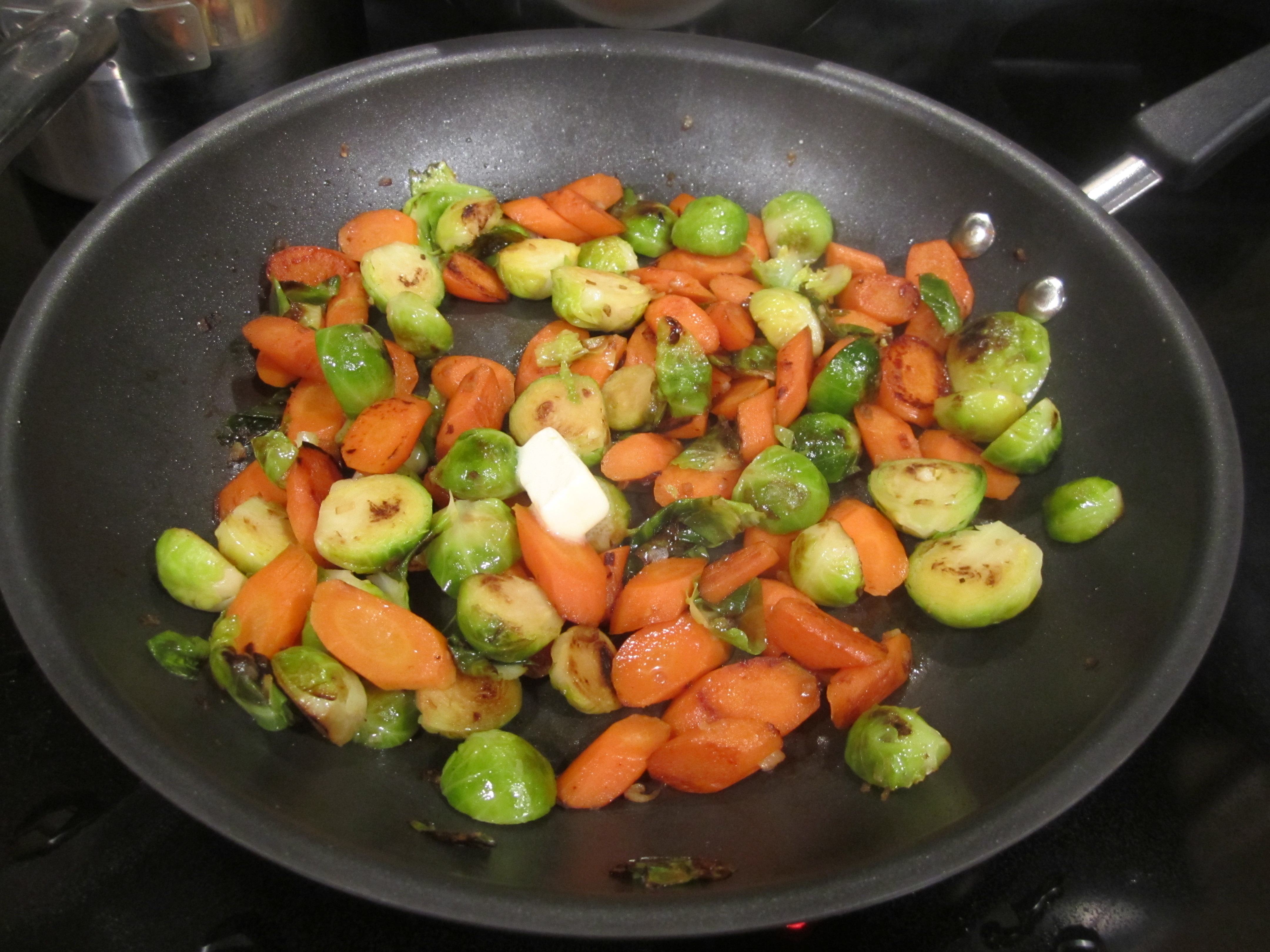 Cook chopped shallots in 1 tablespoon of butter in a 12 inch non-stick anodized pan or heavy skillet, over medium-high heat, for about 1-2 minutes, stirring until soft and somewhat browned. Add carrots and brussels sprouts, 1/4 teaspoon of salt and cook, stirring occasionally, until vegetables begin to brown, about 4-6 minutes.