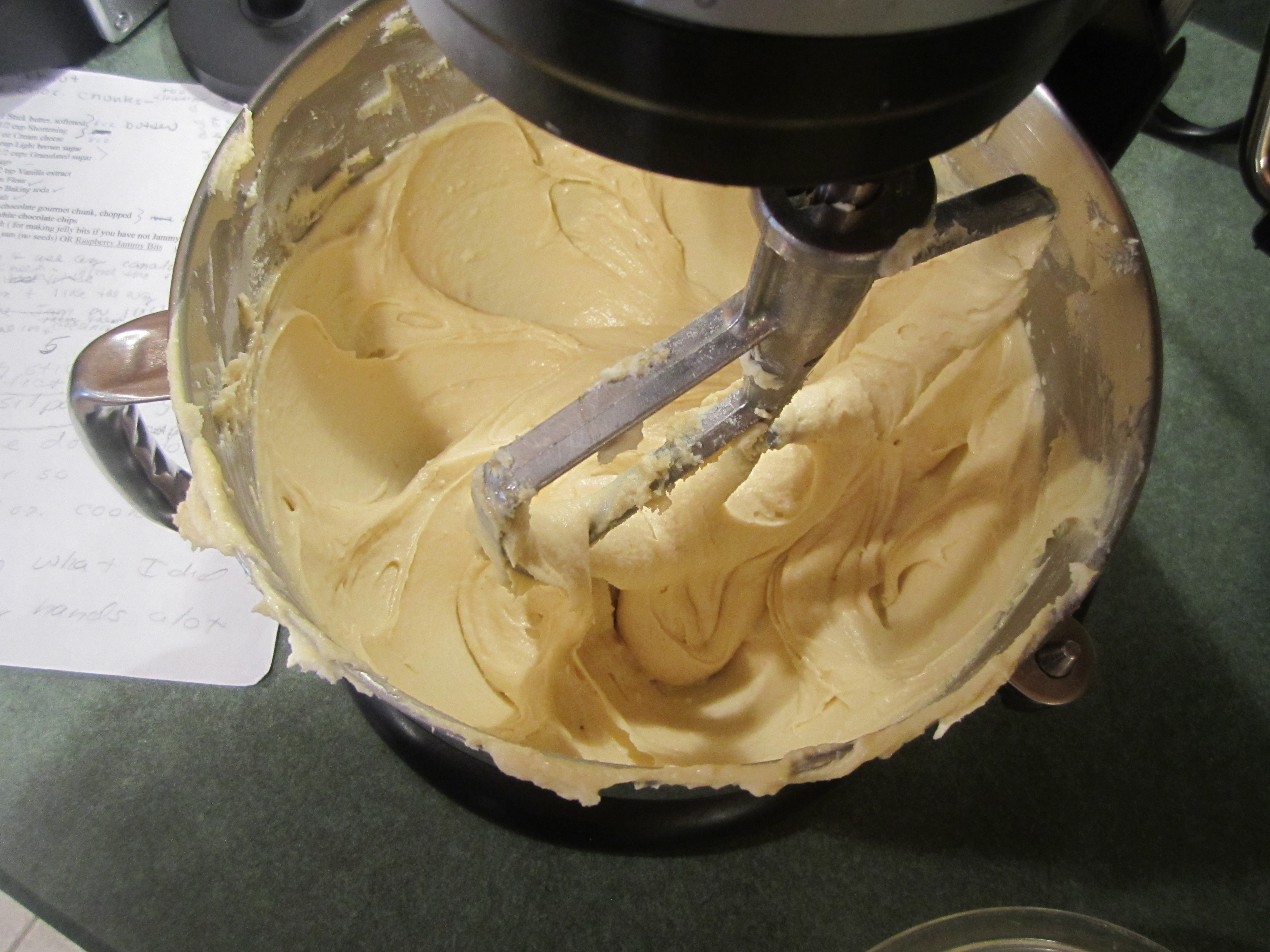 In a stand mixer, beat butter and cream cheese together until soft and creamy. While this is beating, get the rest of the ingredients together. Put sugars in a bowl. Put eggs in small bowl and add vanilla. Whisk together the flour, baking soda and salt in a medium bowl. Measure out baking chips and jammy bits. When butter and cream cheese are creamed, add brown and white sugars and mix thoroughly. Add eggs and vanilla and beat until creamy and somewhat fluffy. Slowly add flour mixture. When just incorporated add chips and jammy bits and beat until just mixed in. Do not over beat.
