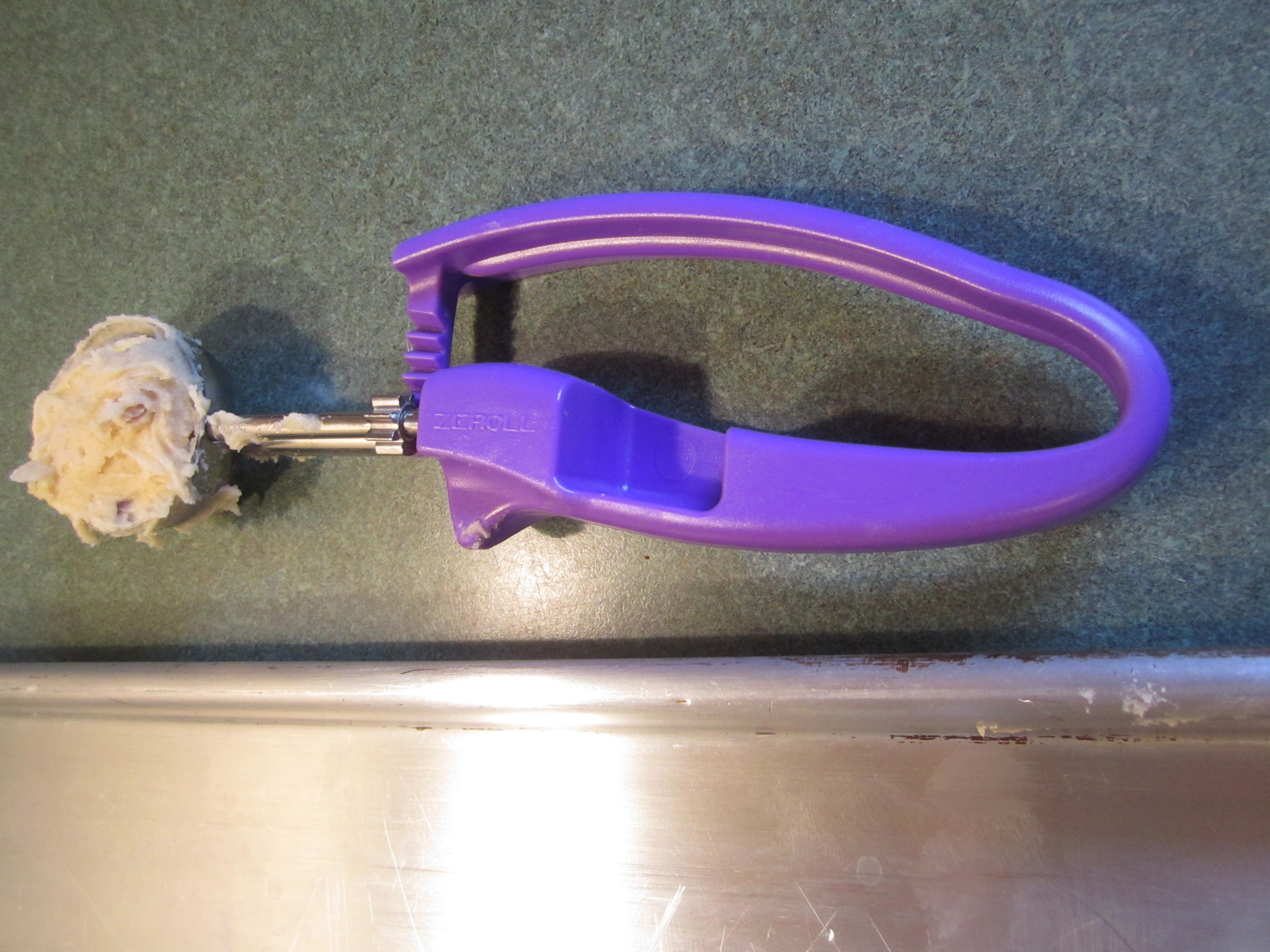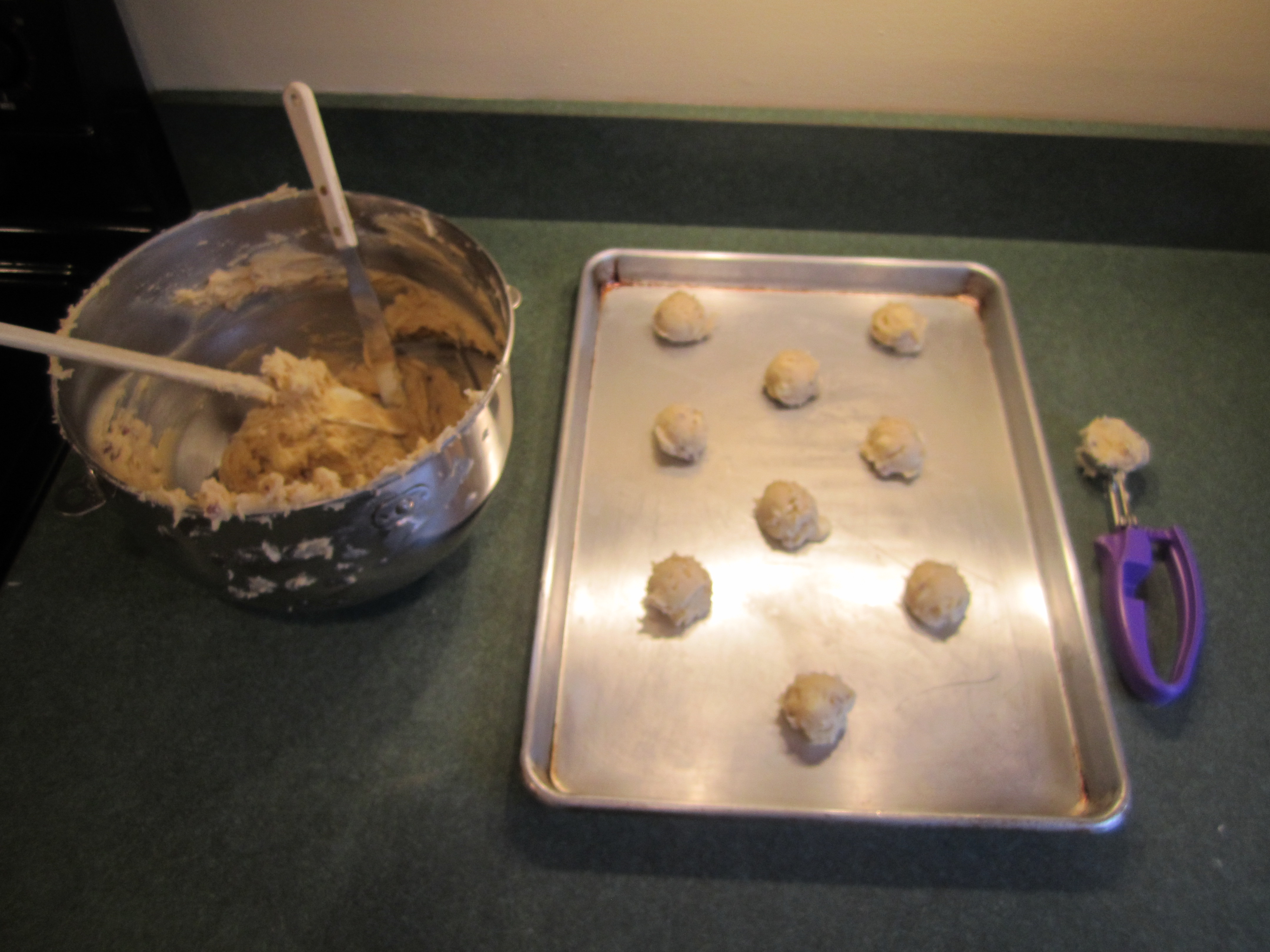 Place 1-1/2 tablespoons of dough onto ungreased cookie sheet. 1-1/2 tablespoons can be accomplished by using a heaping measuring tablespoon of dough or scooping dough with an ice cream scoop and then halving the dough or using a #40 Zeroll Universal EZ Disher or Cookie Scoop, my new toy that I just got when I went to King Arthur Flour for a class (all to be revealed in a later post)!