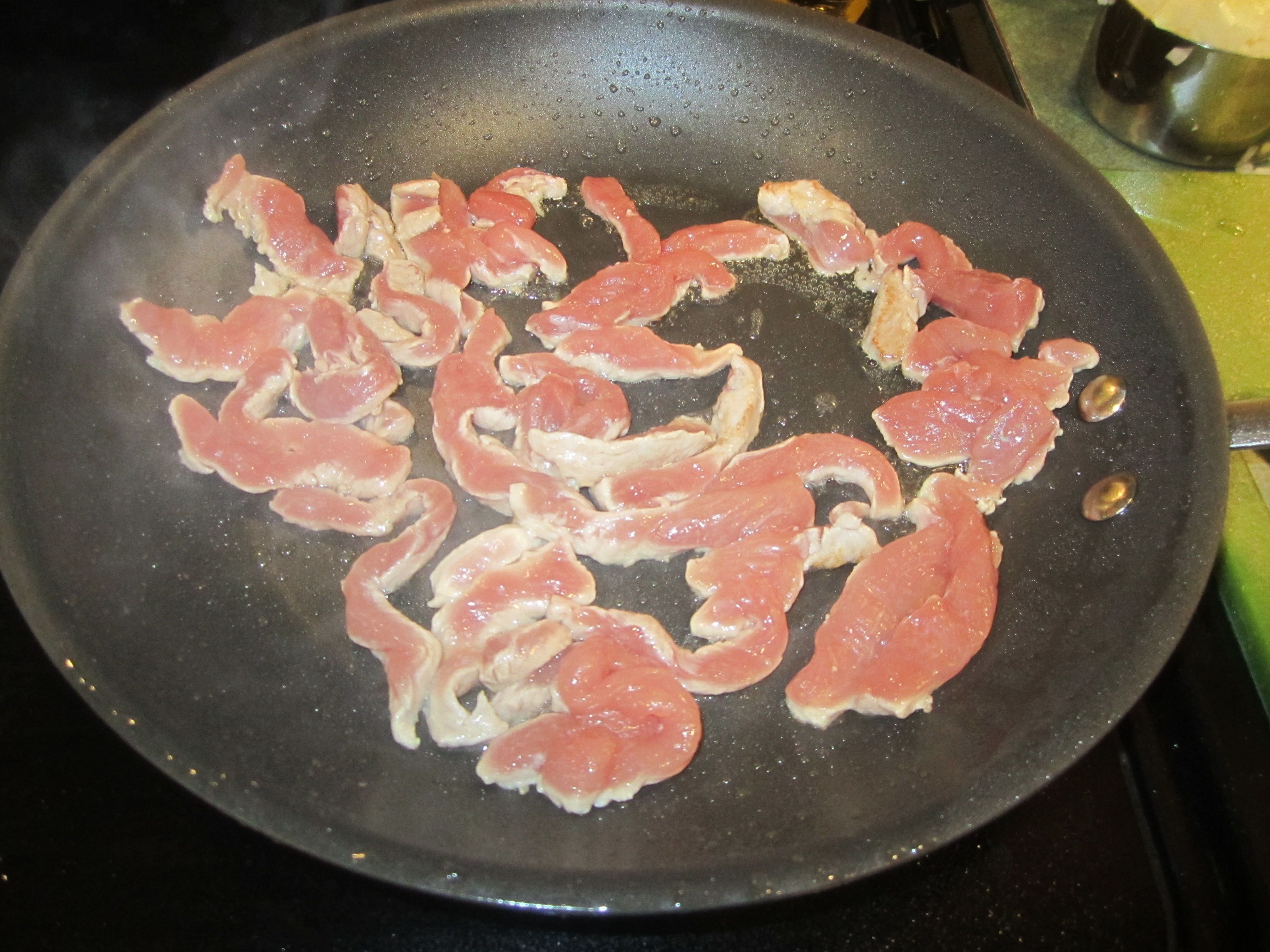 saute 1/2 the pork strips at a time, too many in the pan will not cook properly: