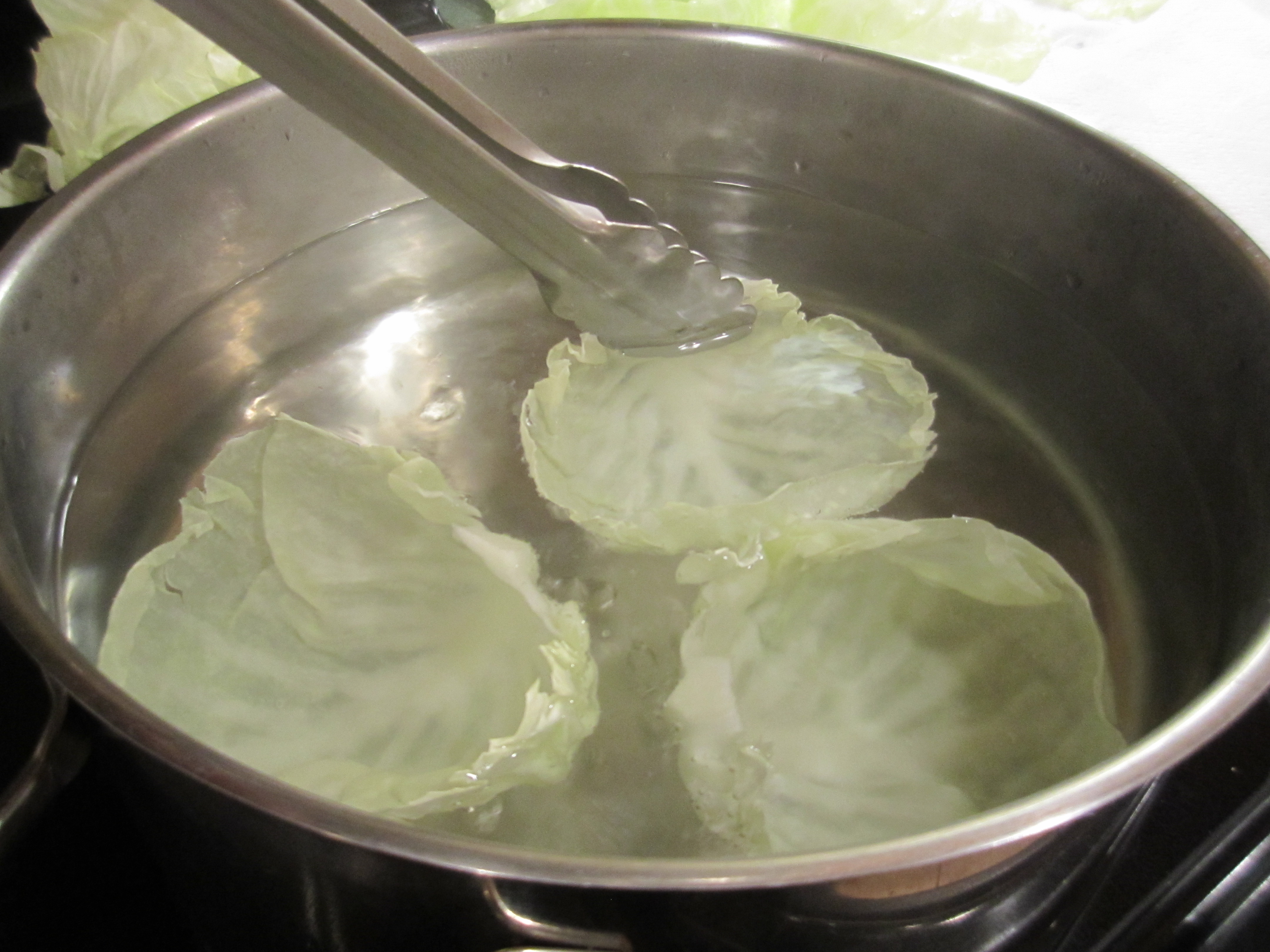 blanching the cabbage leaves (nearly dropped my camera in the boiling water trying to take this shot, yikes!):