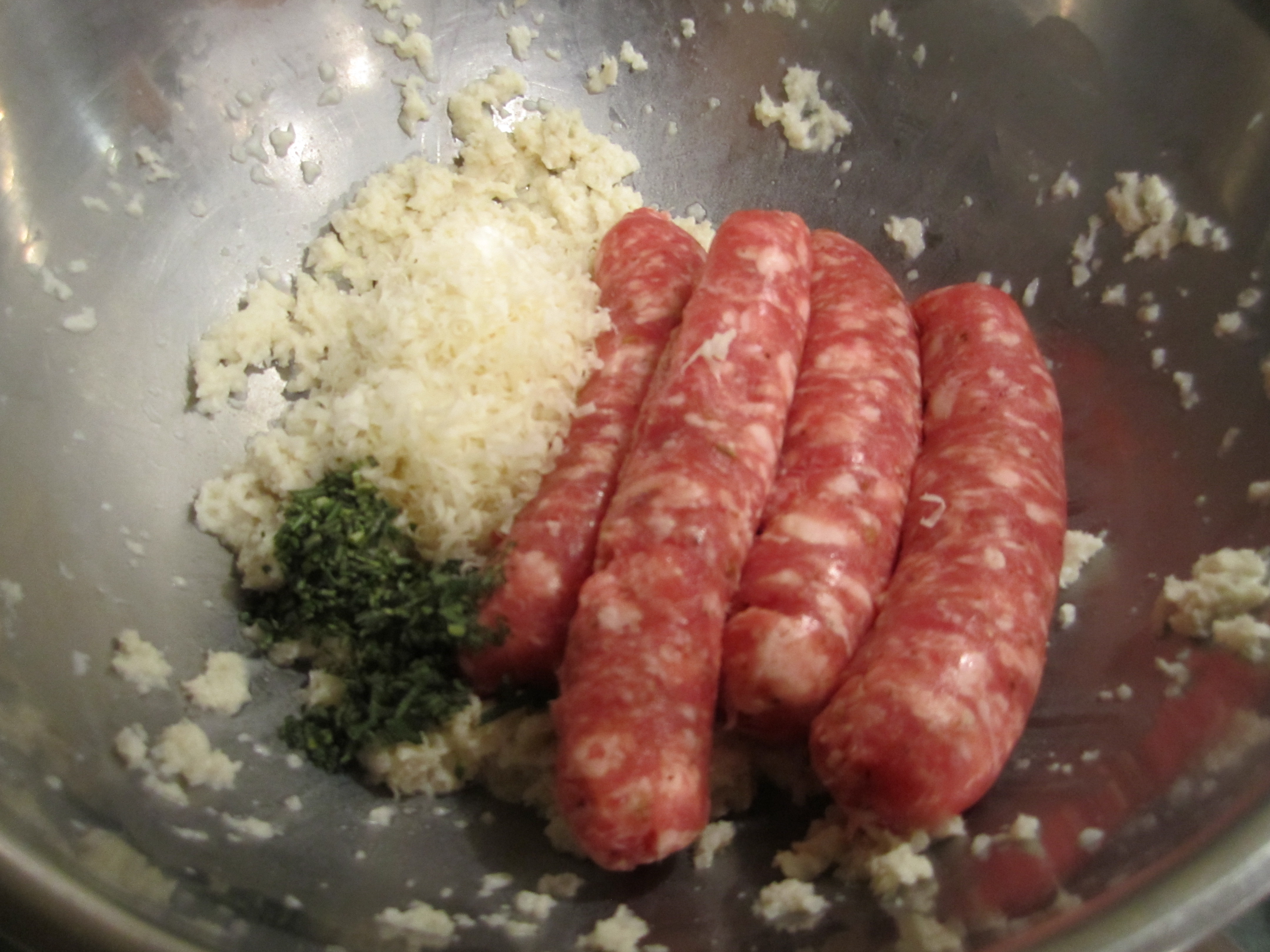 adding sausage, without casings, very optional herbs and parmesan cheese;