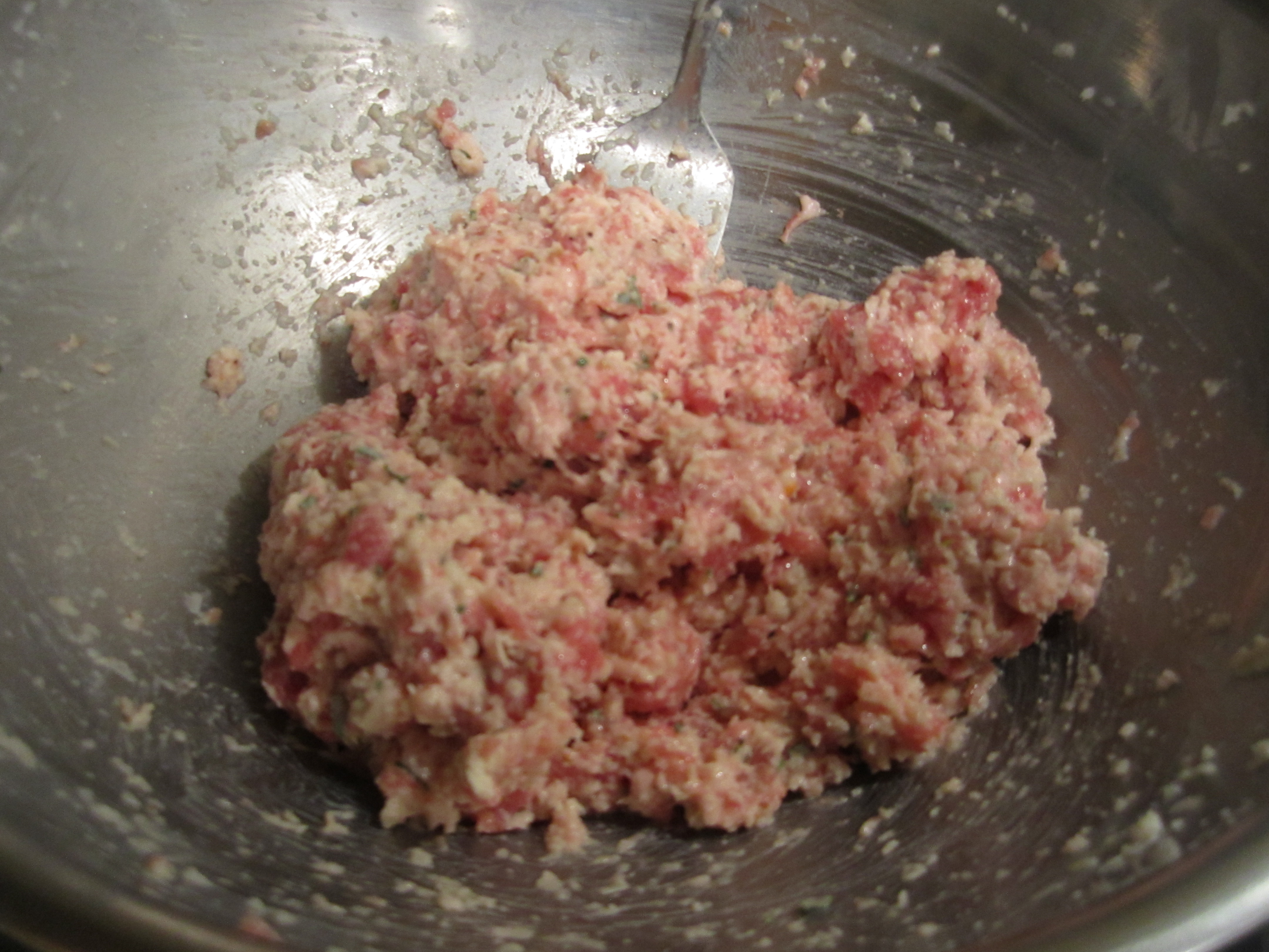 Take the insides out of the chunk of bread, making small bread crumbs. You should have about 3 cups. Place in a large bowl and add the milk. Let it sit while you get the other ingredients together, then mash with a fork until mushy. Add the sausage, very optional sage and rosemary (because of all the herbs in the italian sausage itself, next time I would not put in the extra herbs at all, as per Deb), parmesan cheese and mix with a large fork until combined.