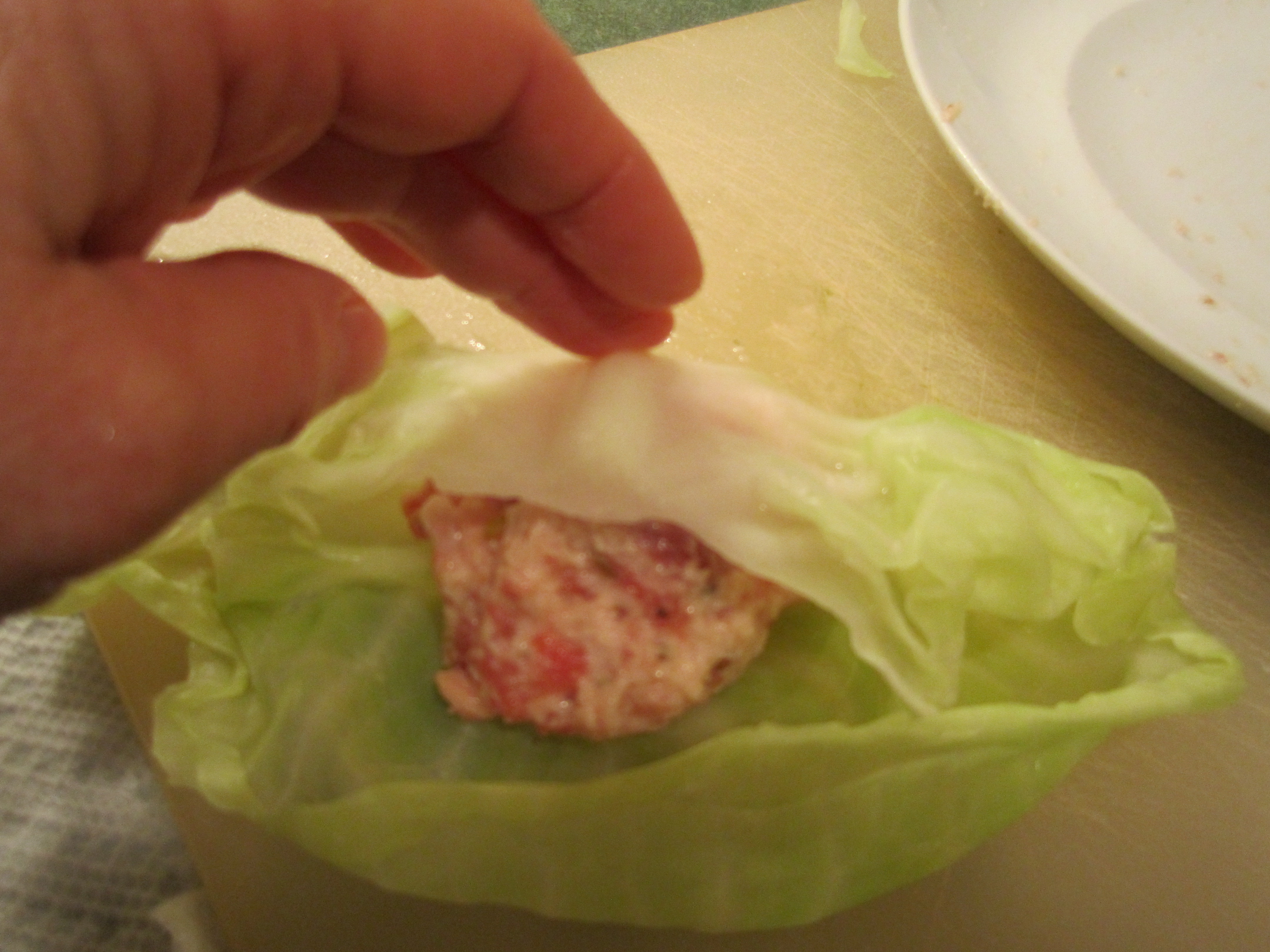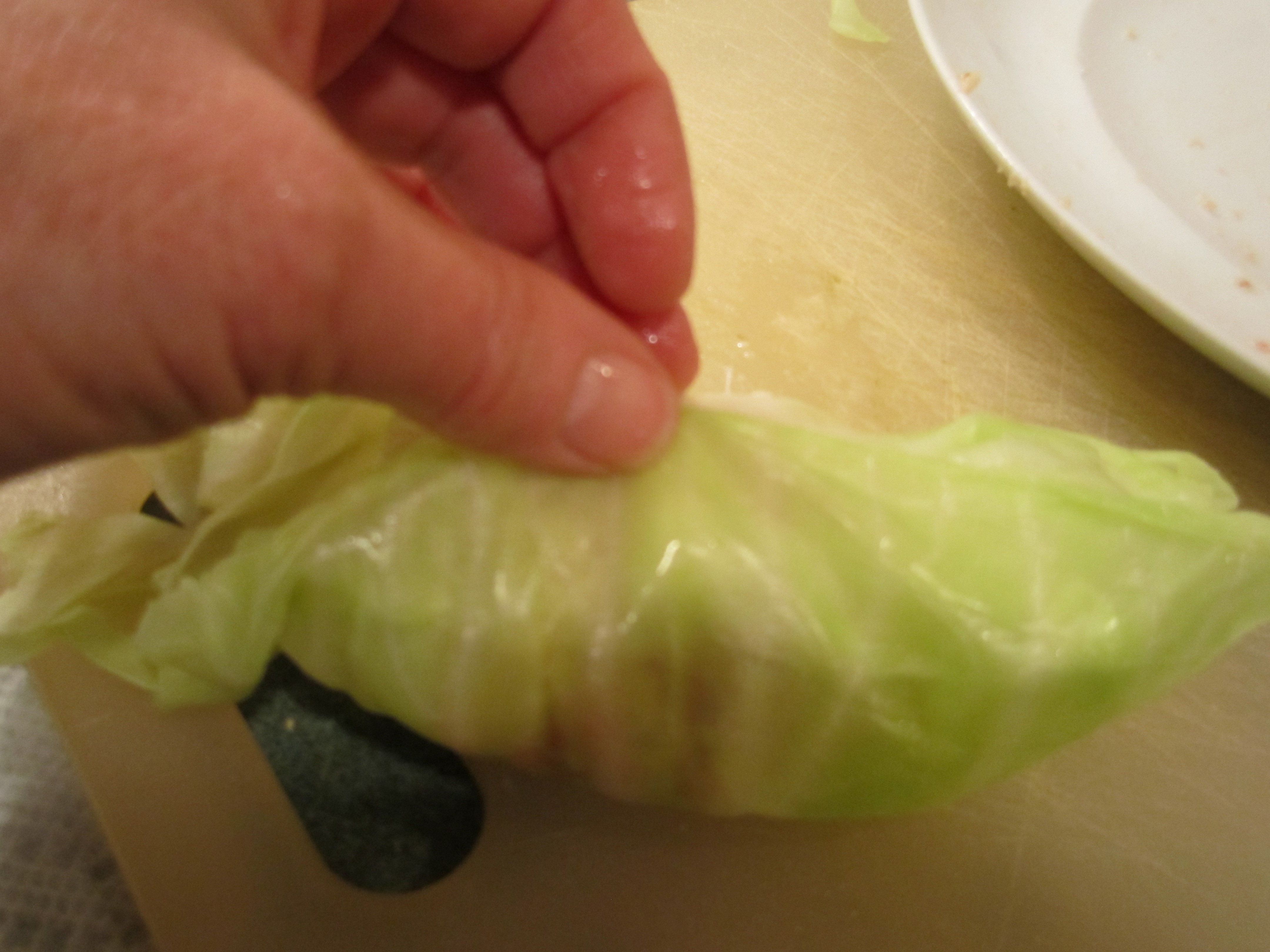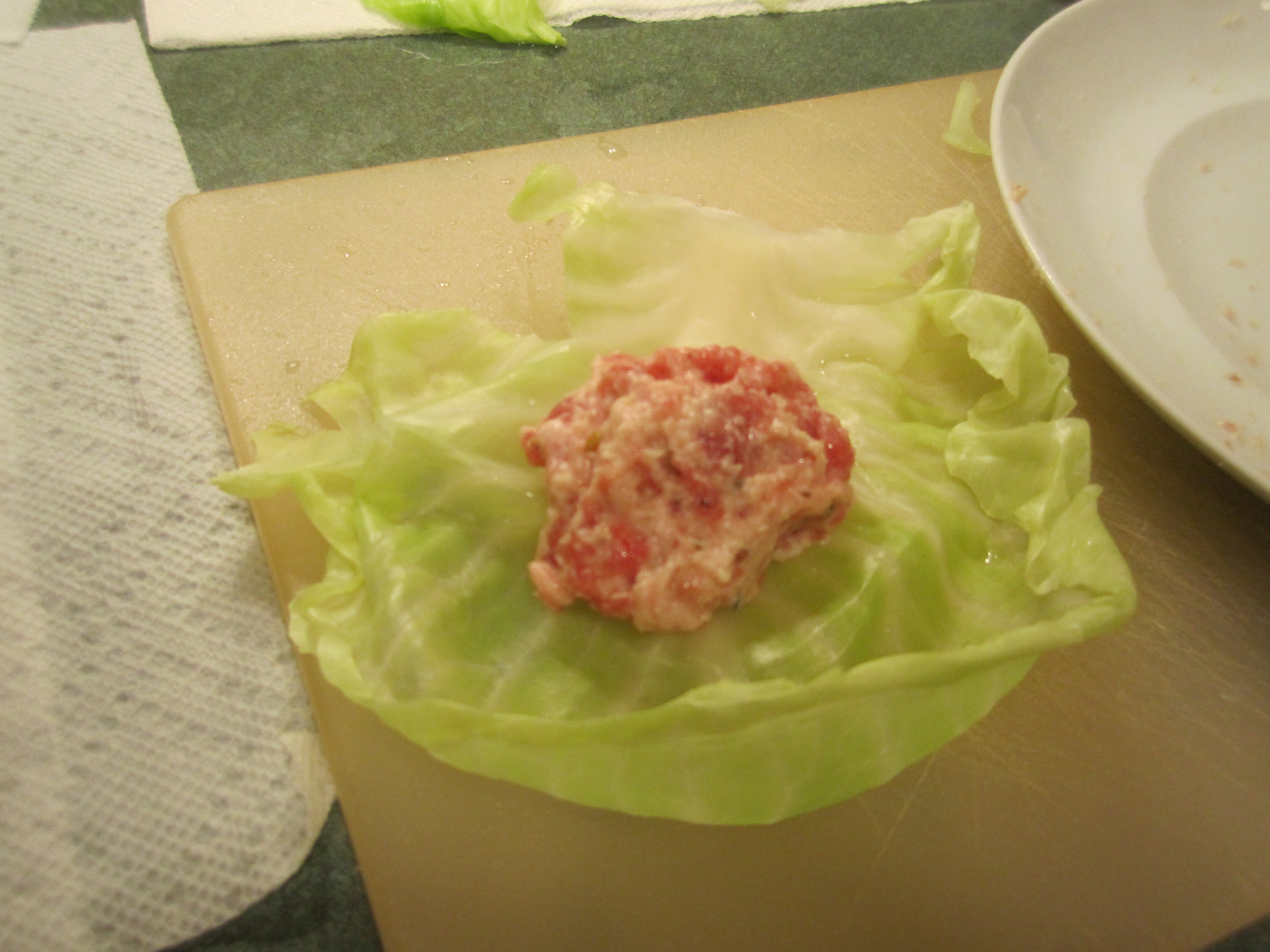 Bring a large (8 quart) saucepan of salted water to a boil. Take off any bad looking cabbage leaves and then carefully peel off 12 cabbage leaves. I had a small cabbage so that’s why I emphasized the size. I had a lot of trouble with this, I think because of the size. Finally, after a bit of trial and error, I took off as much of the stem end as possible and then put the cabbage under very warm running water. I used the water plus some gentle pressure, to take the leaves off. It worked but some of the leaves were very small. I ended up taking some broken blanched leaves and using those to help enclose the filling with the small leaves. But anyway, onward. Blanch the leaves: the savoy per Deb take 30 seconds to 1 minute, the regular green cabbage leaves take 2 minutes, until wilted and remove with tongs onto paper towels.