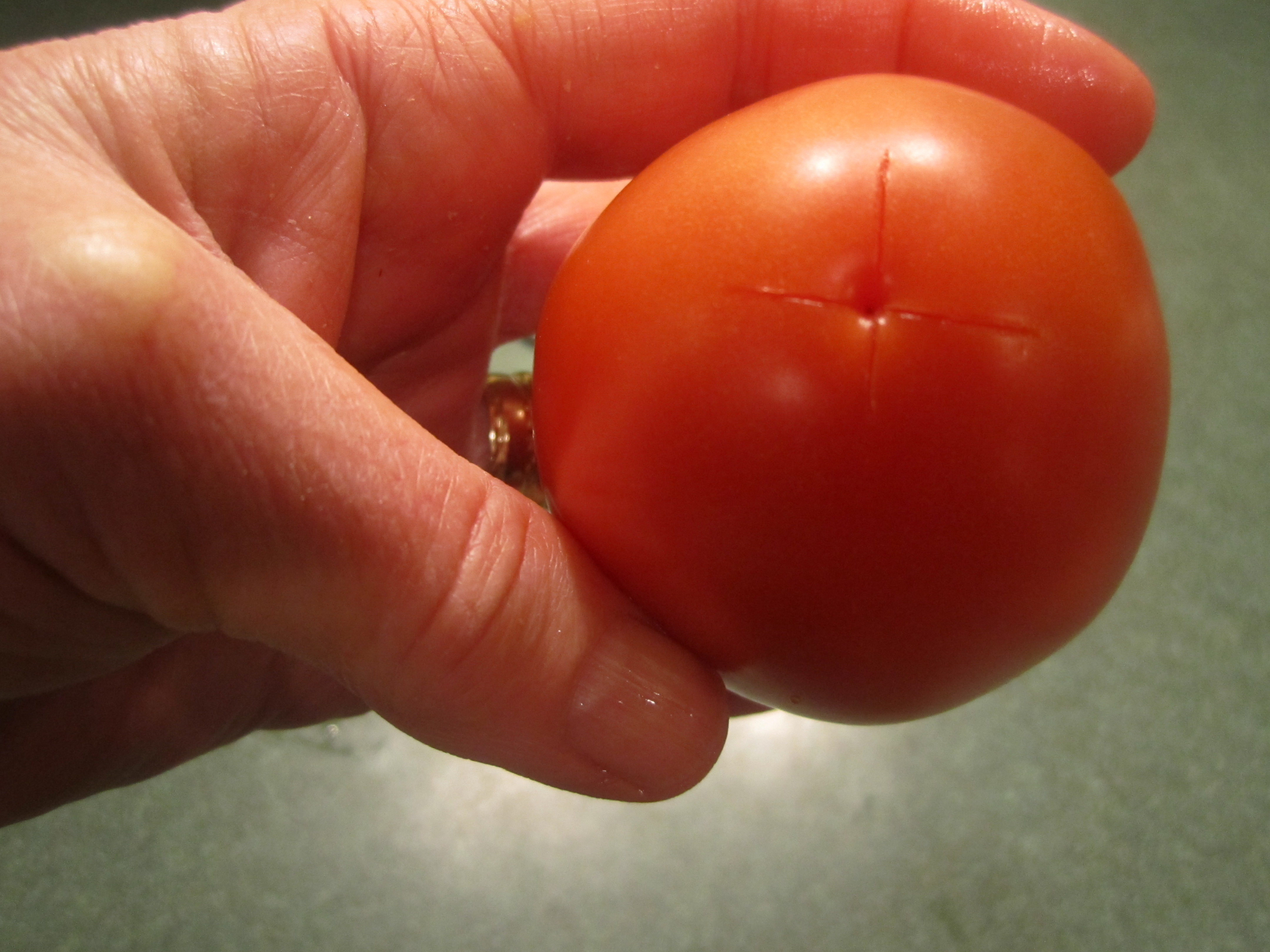 Bring a large pot of water to boil. Then fill a large bowl with cold water and a few ice cubes, and set aside. Prepare tomatoes by scoring the end (not stem end) with a shallow little X mark.