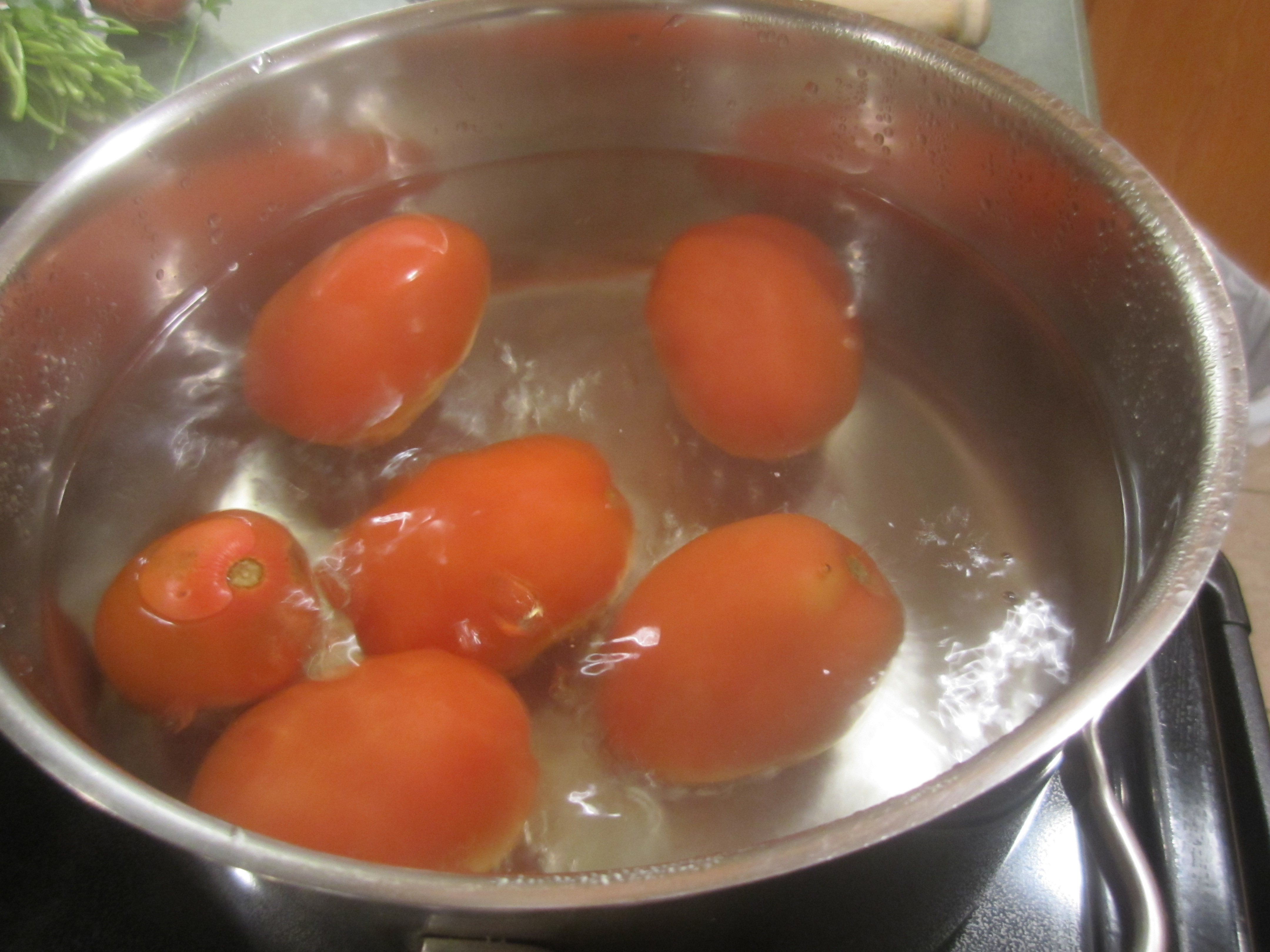 When water has come to a boil, set aside a slotted spoon. Drop tomatoes gently into boiling water and in a about 30 seconds you will start to see the skin peeling off. When this happens, remove the tomato with the slotted spoon to the cold water. The skin might not do this to all of them at once, so just keep watching.