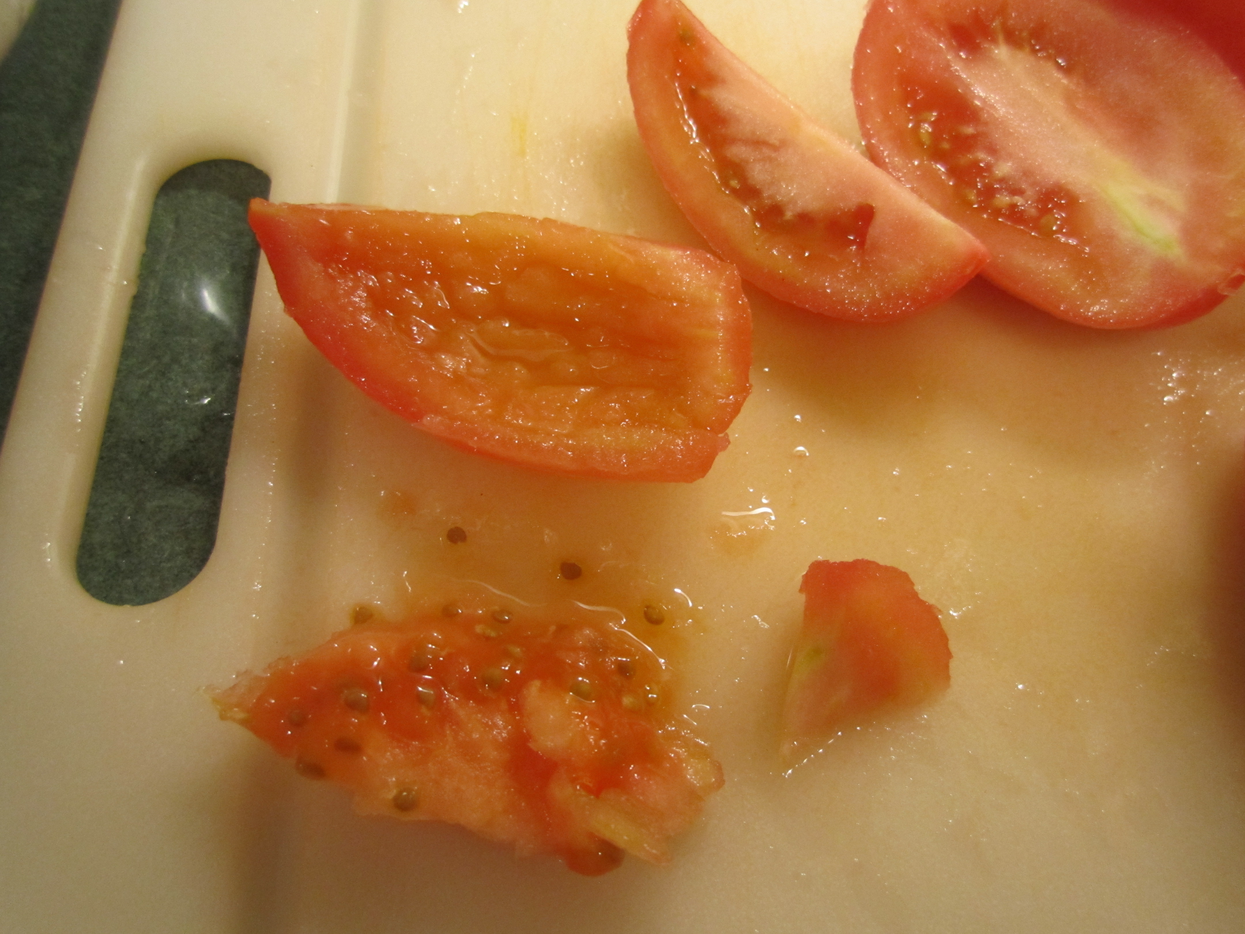removing seeds, jelly stuff, and hard core from inside tomato wedge: