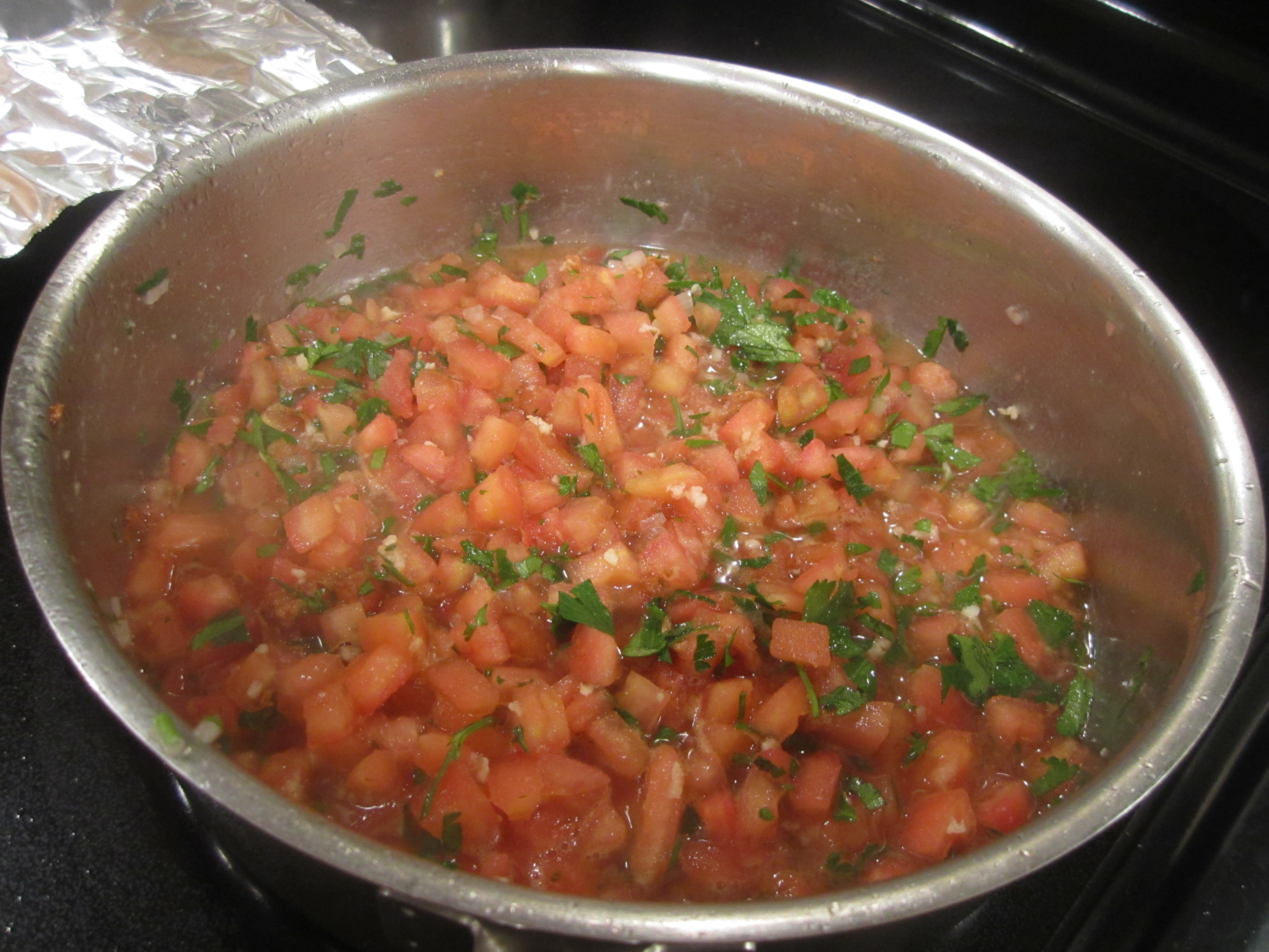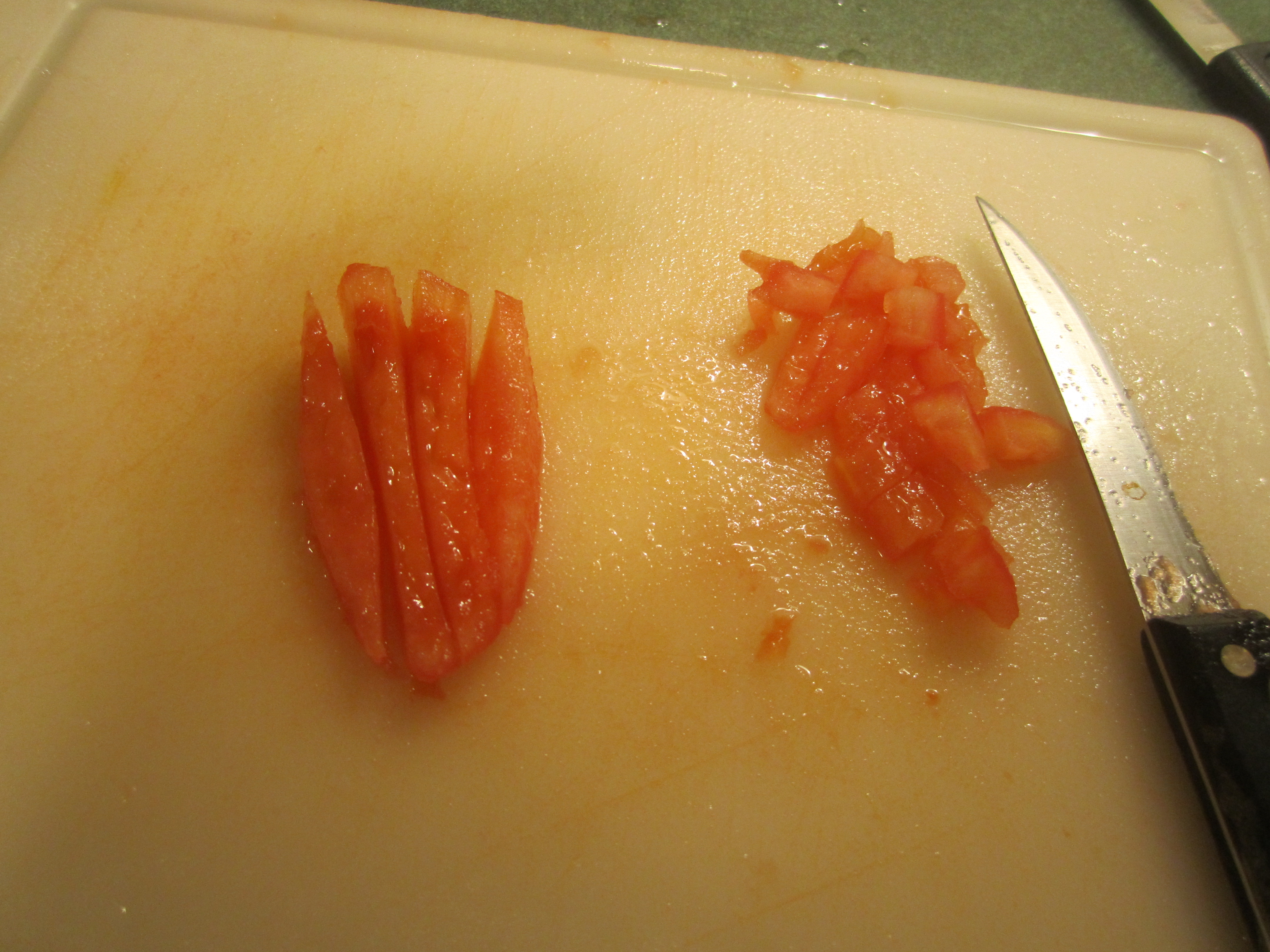 Cut tomatoes into quarters and remove all seeds, jelly stuff, and hard core inside tomato wedge. Do this to all the tomatoes and set aside. When you have completed all the tomatoes, cut each quarter into 4 strips and then dice the strips, setting aside in a bowl.