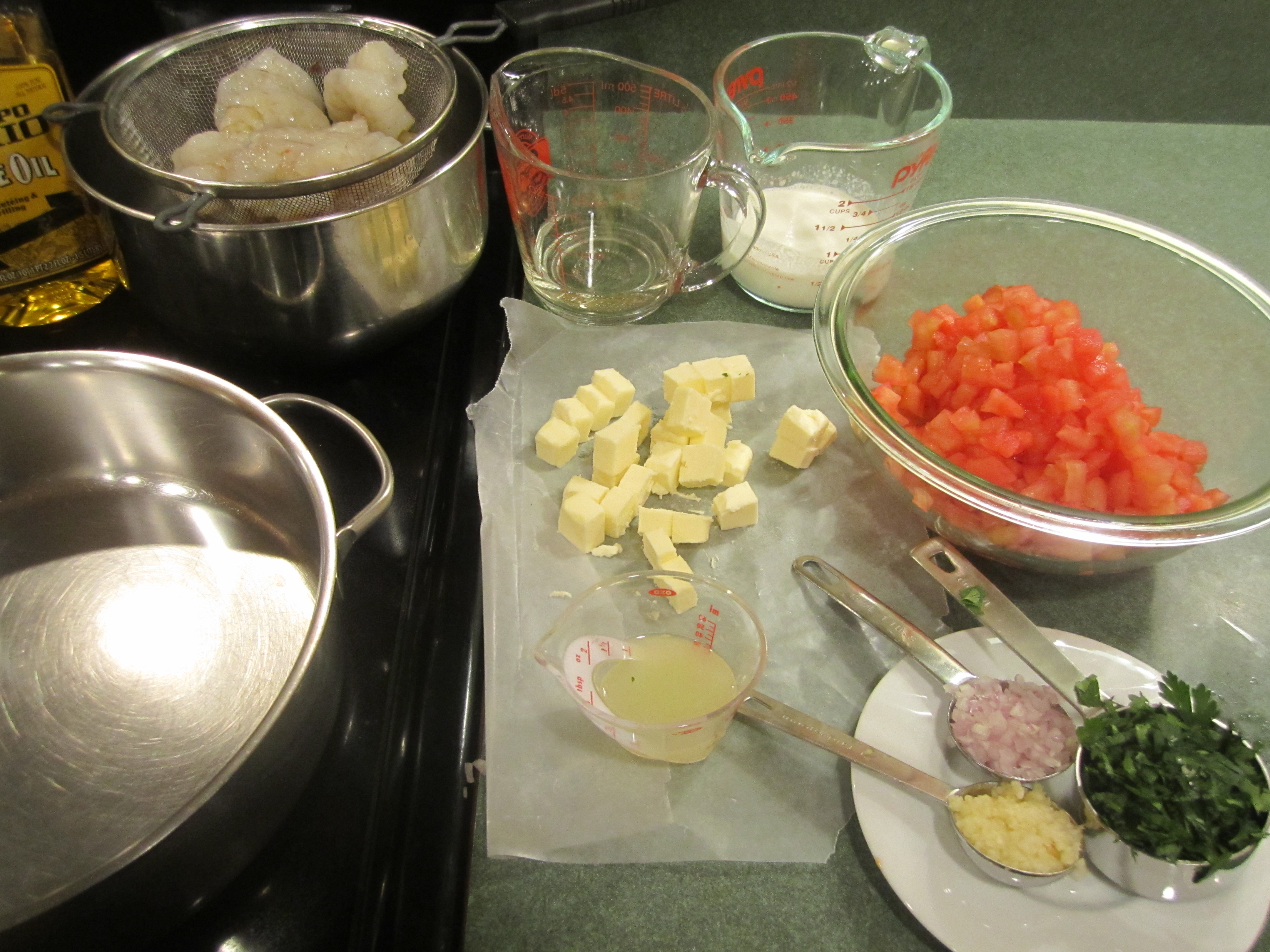 While waiting for the water to come to a boil, defrost the shrimp, according to the directions on the bag. When finished, set aside shrimp in strainer over a bowl in the refrigerator.