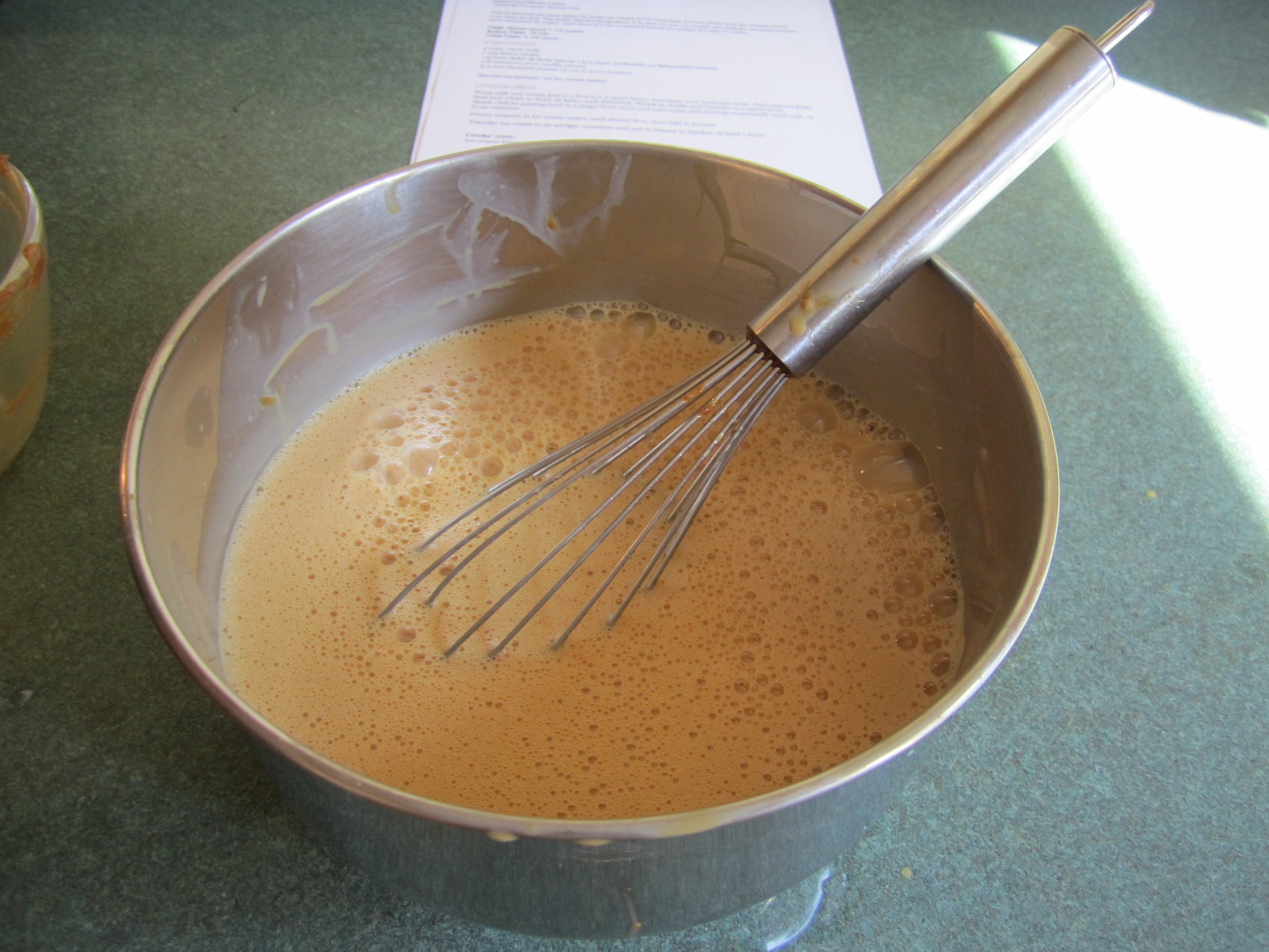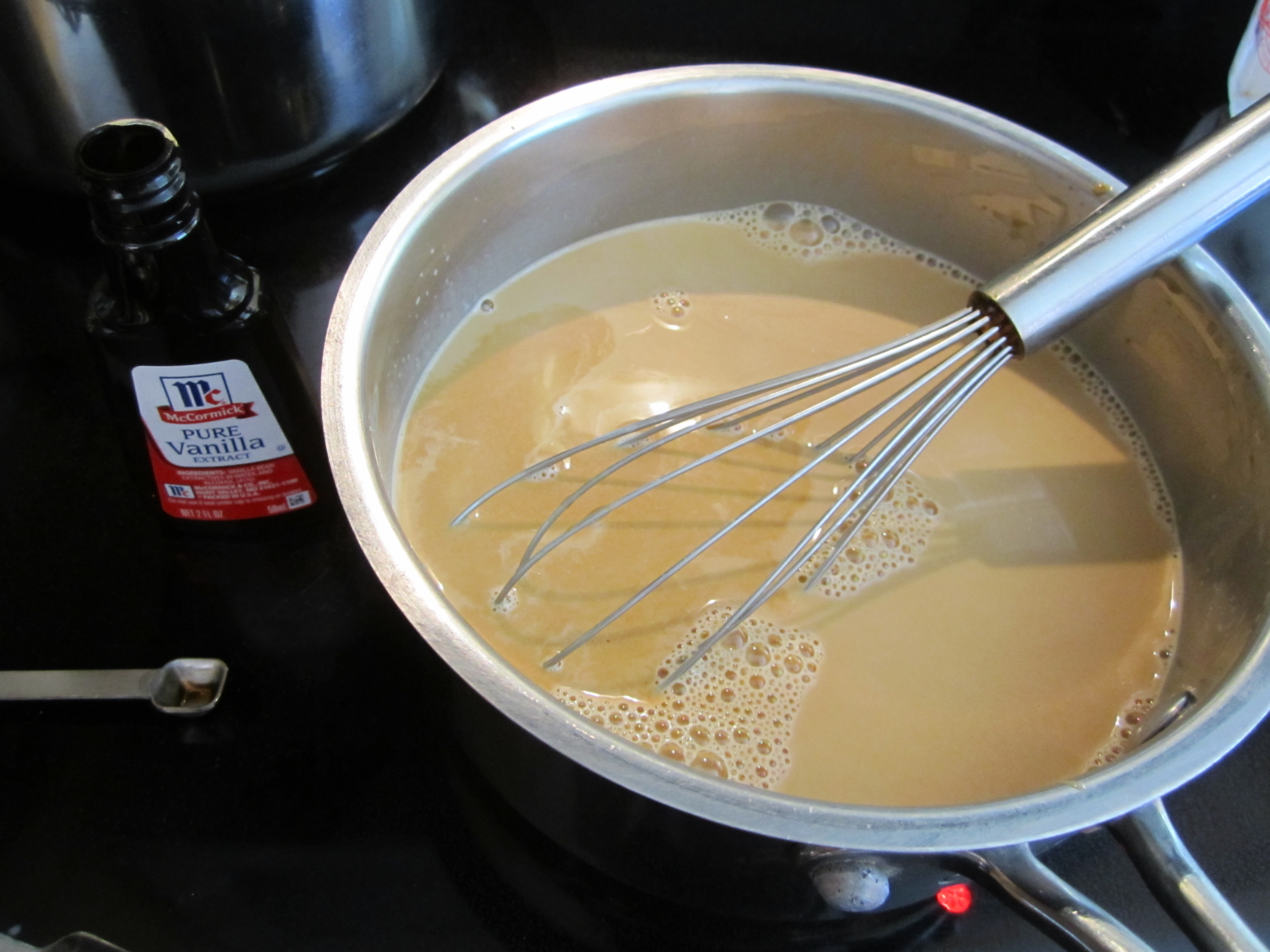 Remove milk/cream from heat, add caramel and whisk until thoroughly combined.  I actually had to put mine back on the heat for a little bit to make sure the caramel had completely dissolved: