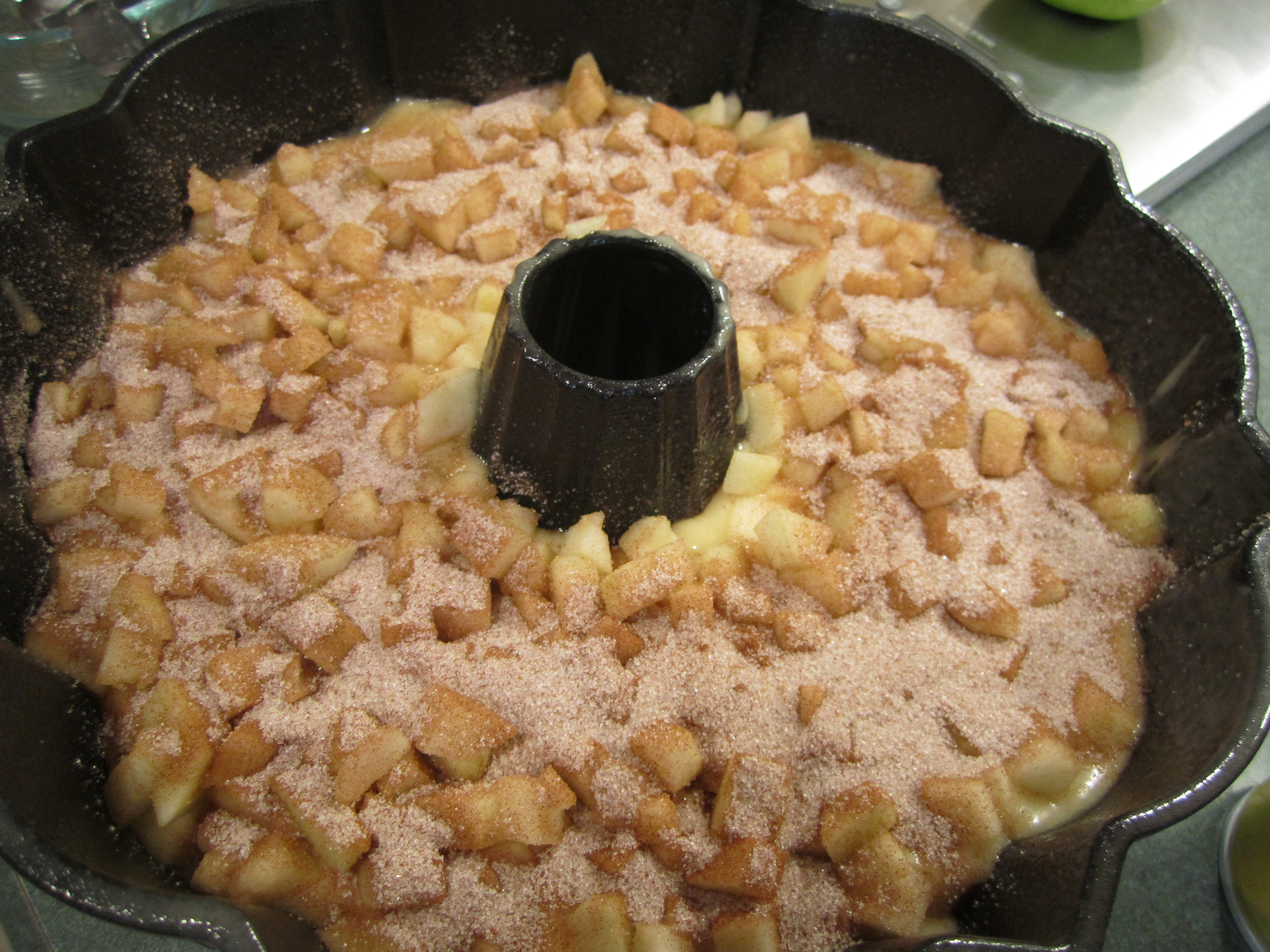 1/2 the batter, with 1/2 the apples and 1/2 cinnamon-sugar and on top: