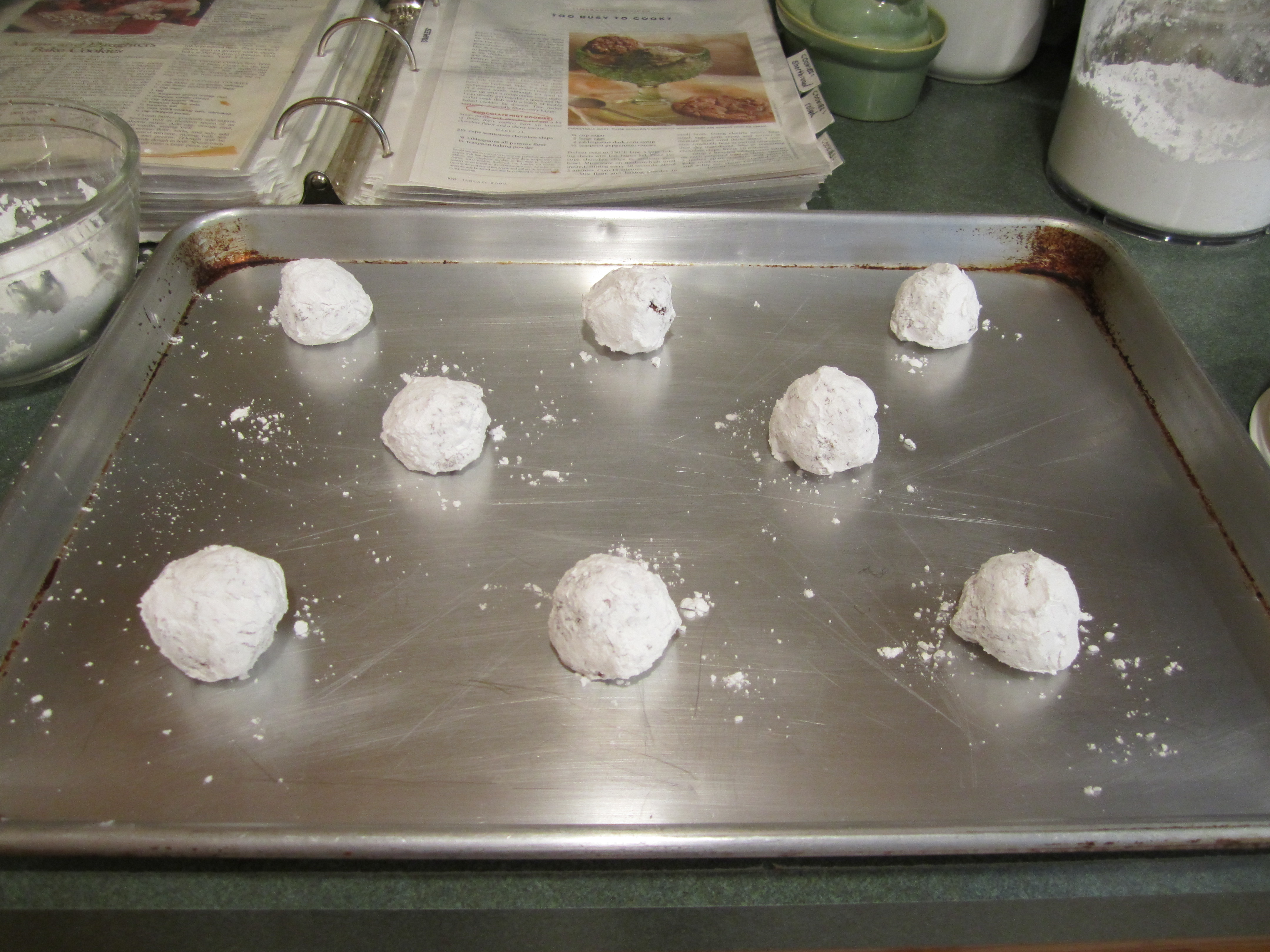Shape dough into 1 inch balls and roll in confectioner sugar. Place cookies 2 inches apart on cookie sheet. Bake for 12 minutes, turning cookie sheet half way through. Cool on wire racks.